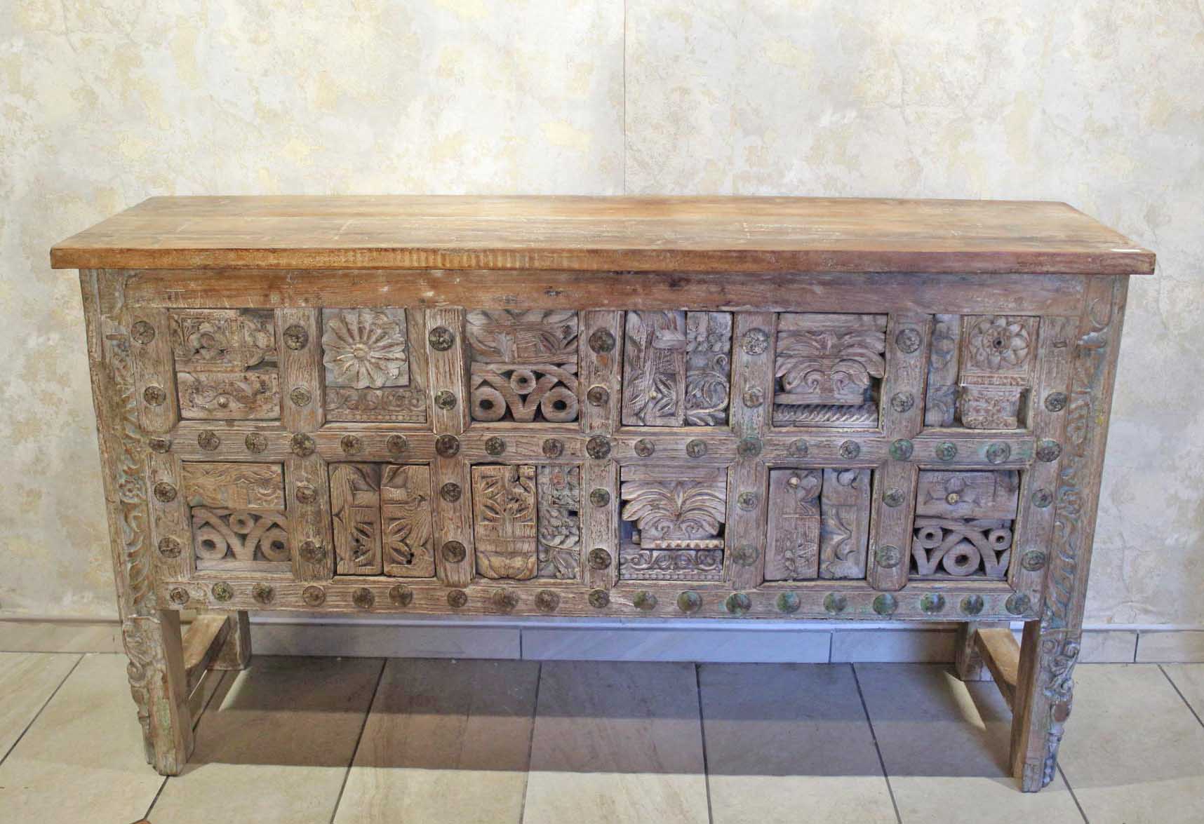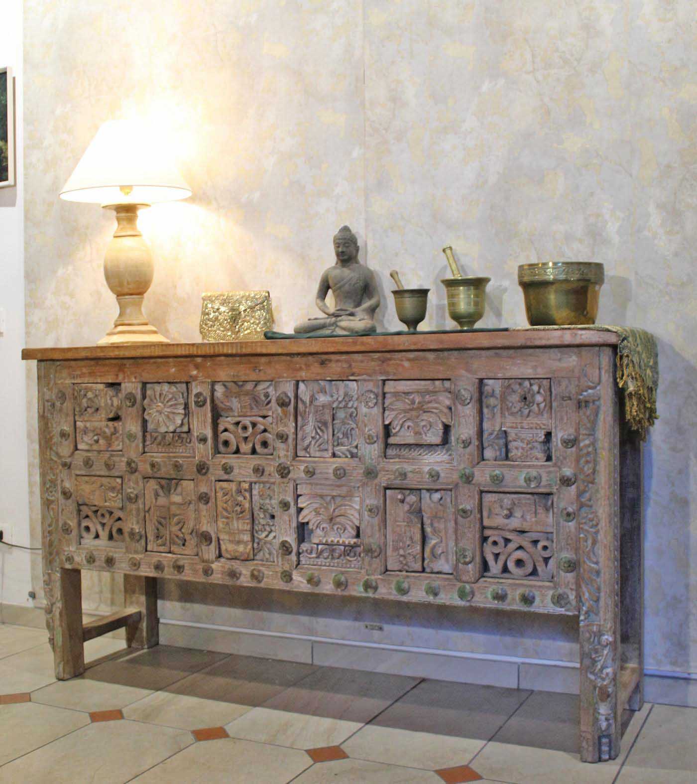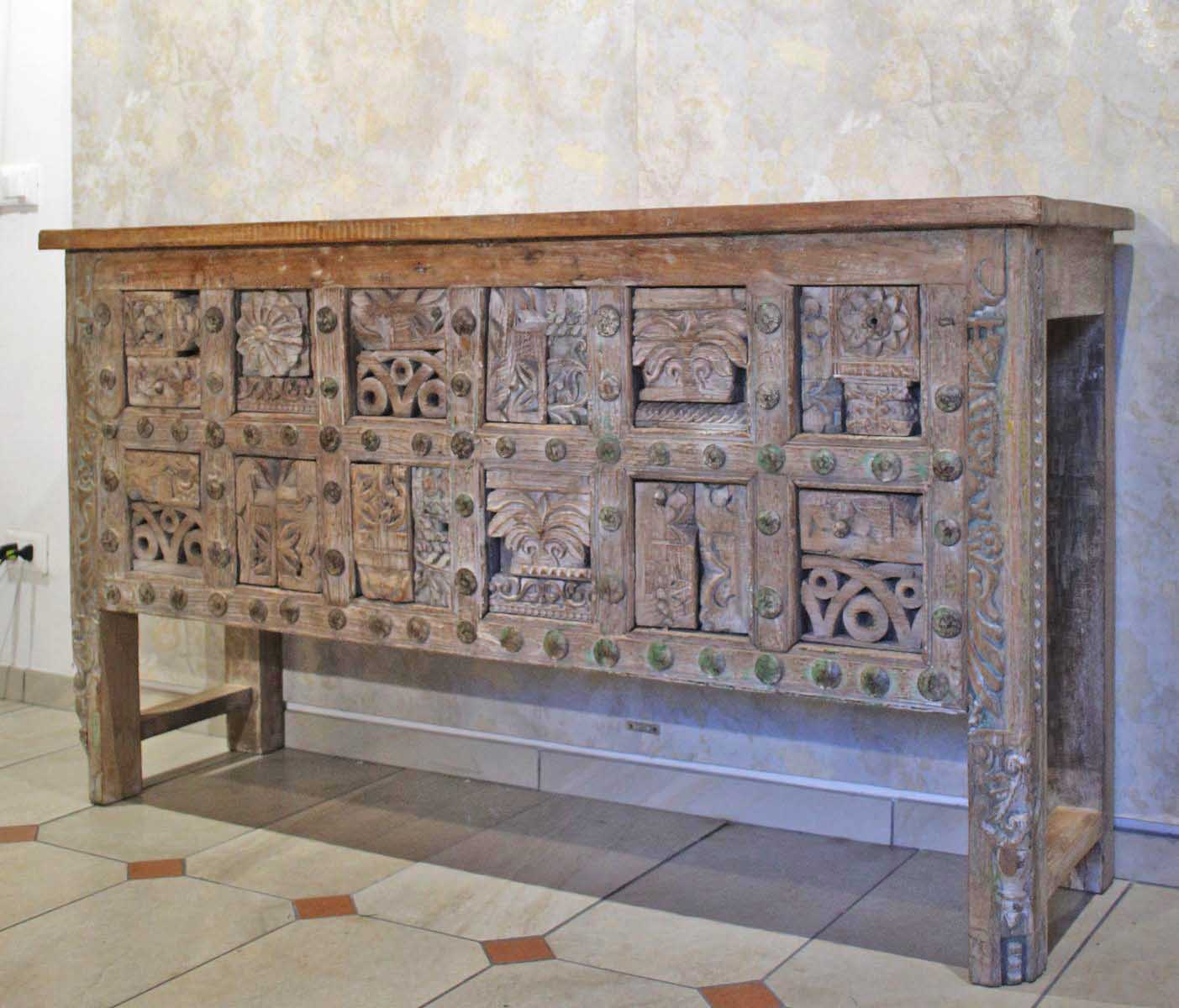 La struttura è lineare ed essenziale, studiata per mettere in primo piano la ricchissima parte frontale, vero cuore decorativo della consolle, composta da un magnifico patchwork di fregi d’antiquariato, elementi lignei originali finemente intagliati a mano, provenienti da antiche architetture indiane e sapientemente assemblati.