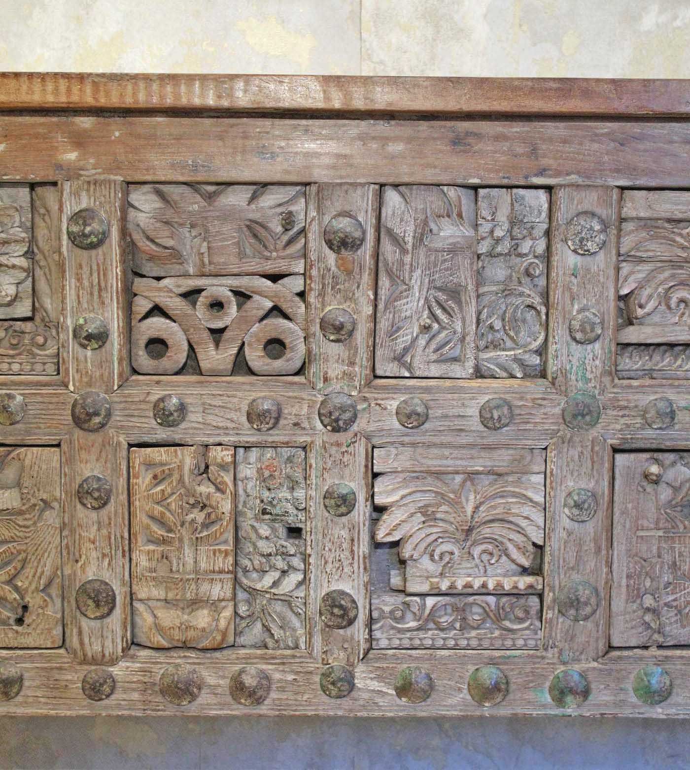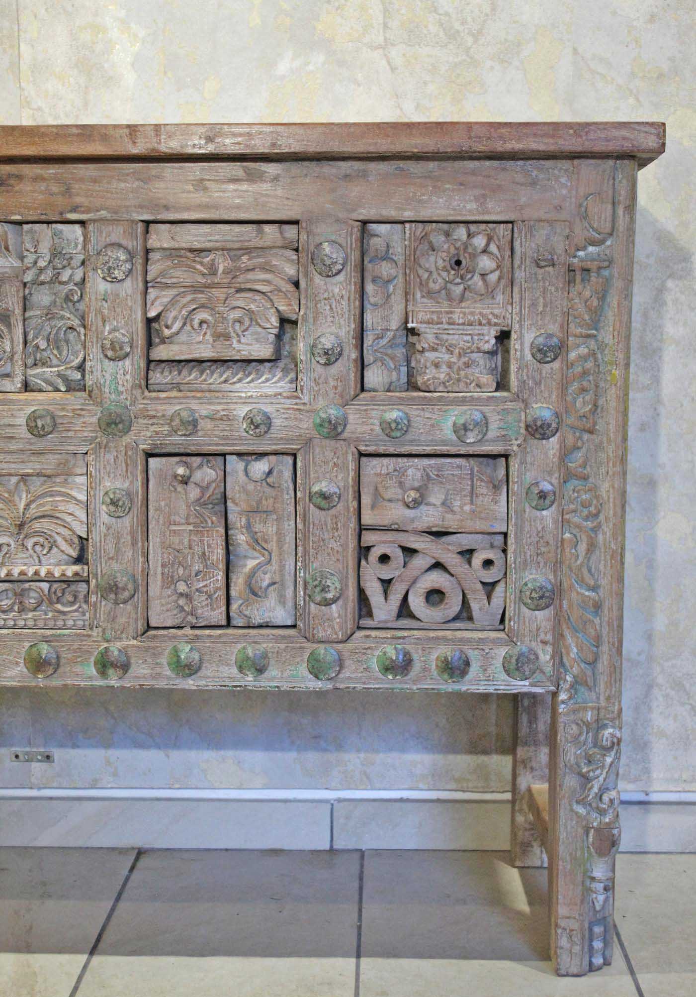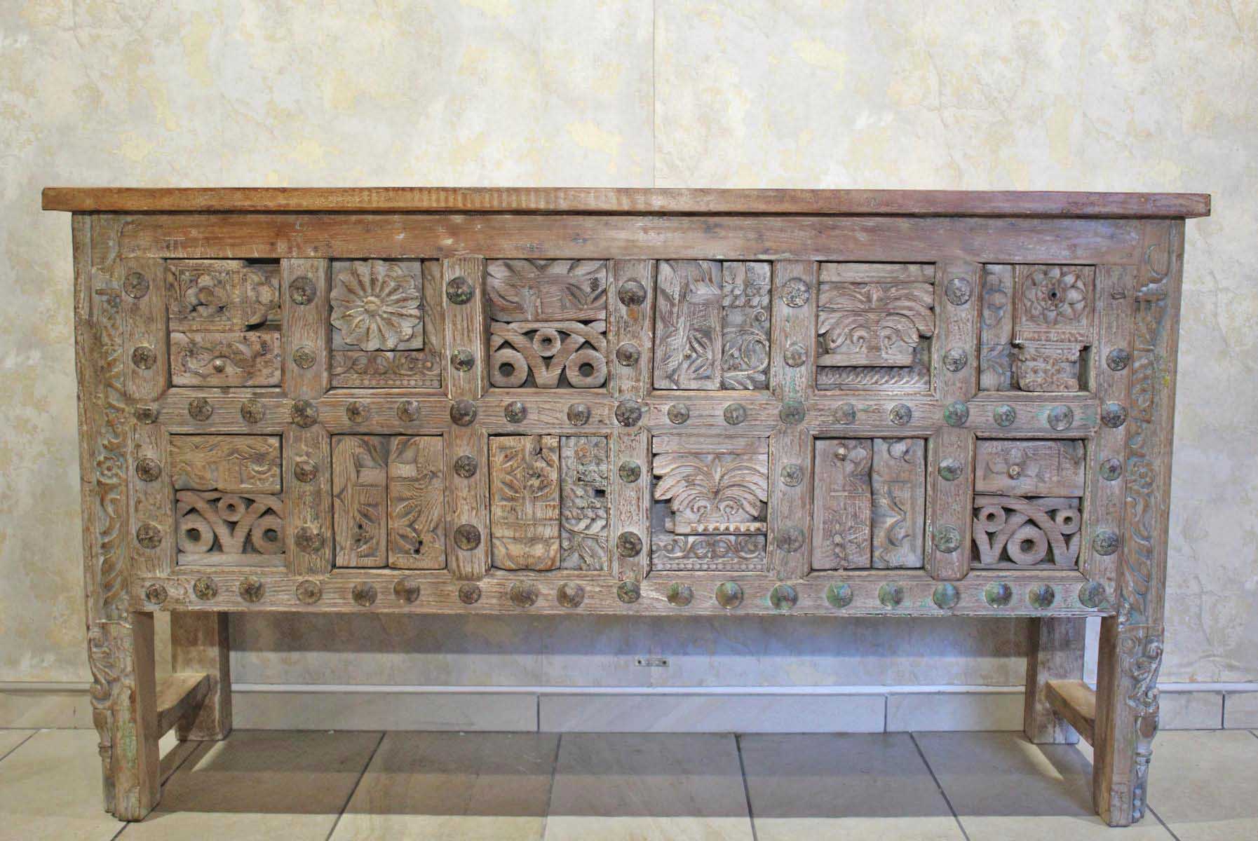 La struttura è lineare ed essenziale, studiata per mettere in primo piano la ricchissima parte frontale, vero cuore decorativo della consolle, composta da un magnifico patchwork di fregi d’antiquariato, elementi lignei originali finemente intagliati a mano, provenienti da antiche architetture indiane e sapientemente assemblati.
