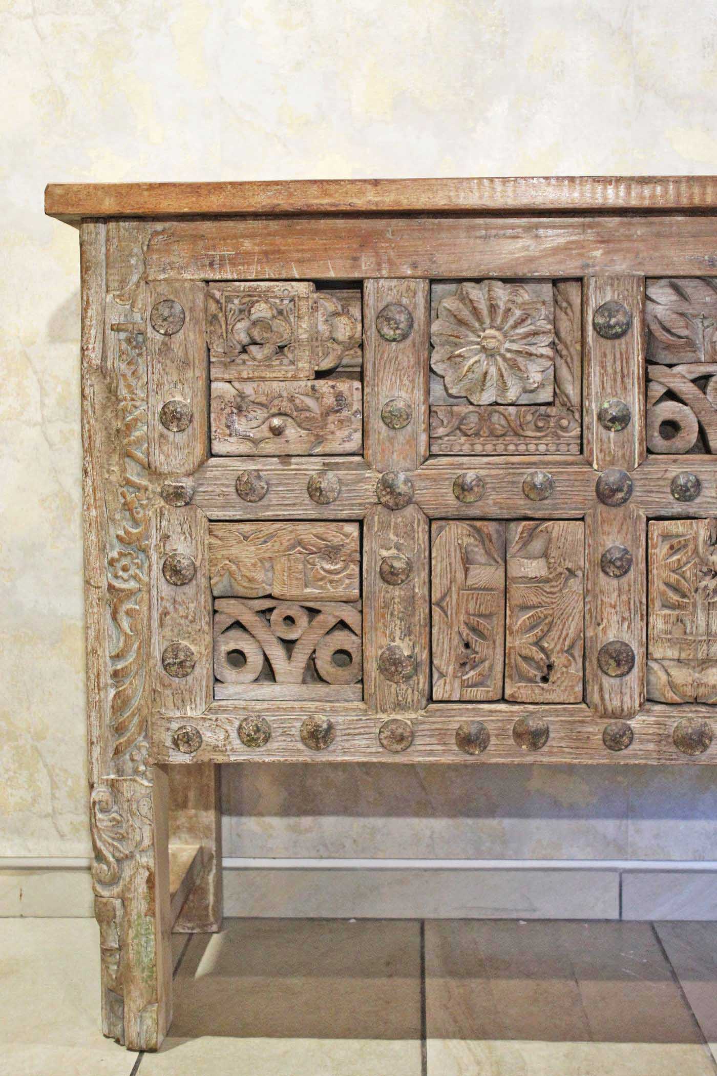 Consolle realizzata in India in legno leggermente lavato bianco con parte frontale realizzata con fregi antichi originali