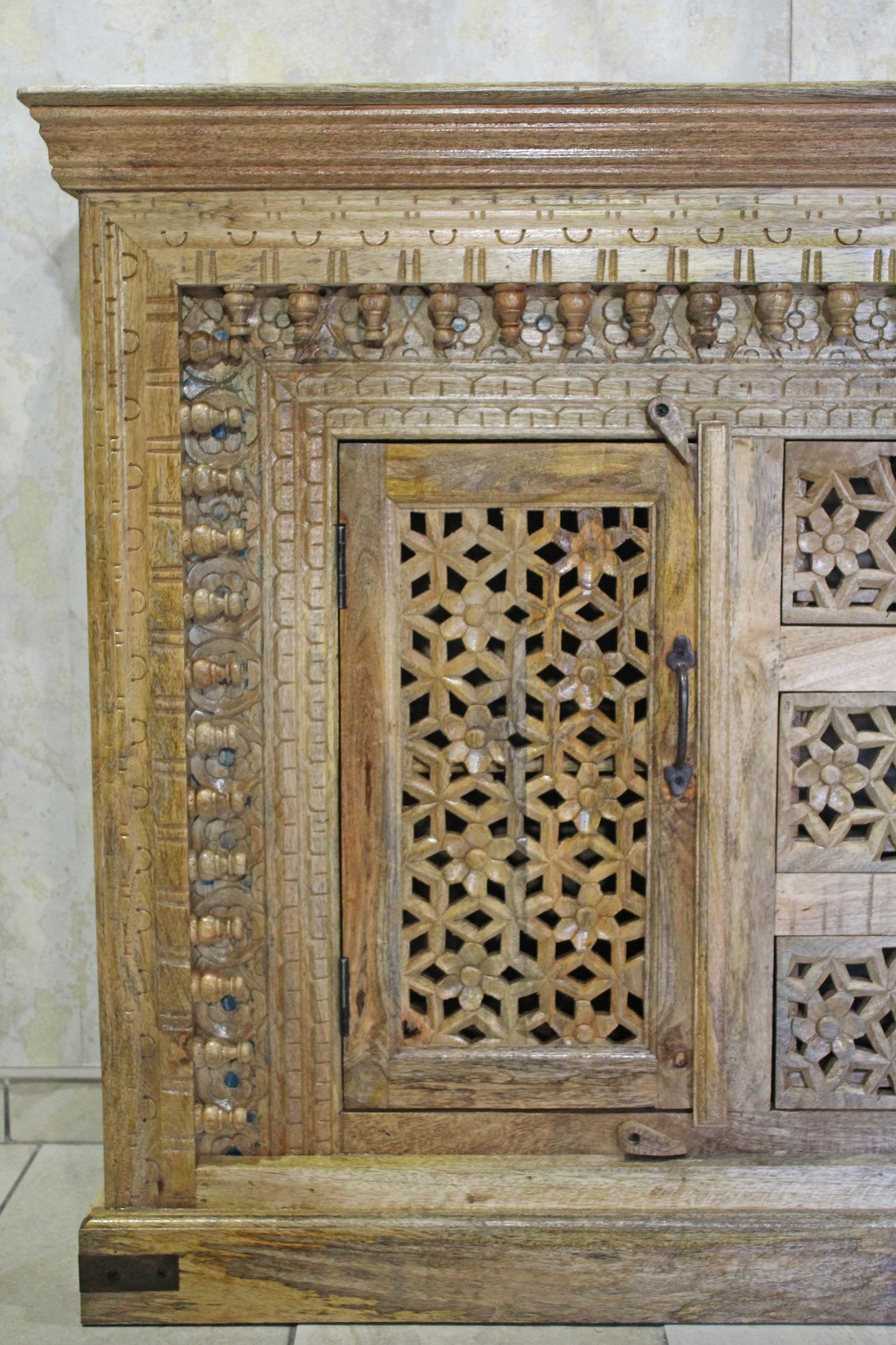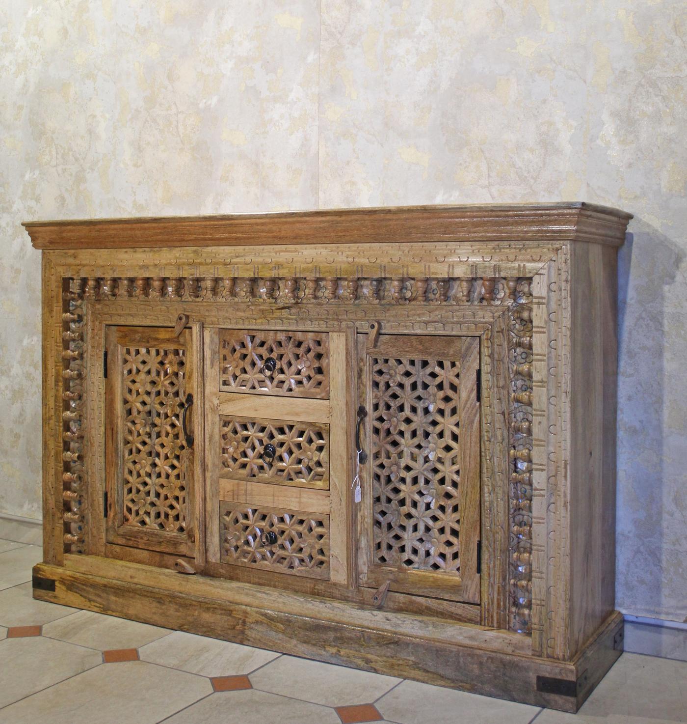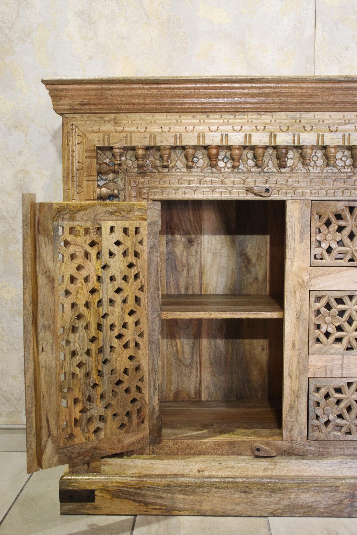 Credenza indiana a due ante e tre cassetti, in legno intagliato lasciato al naturale con finitura lucida