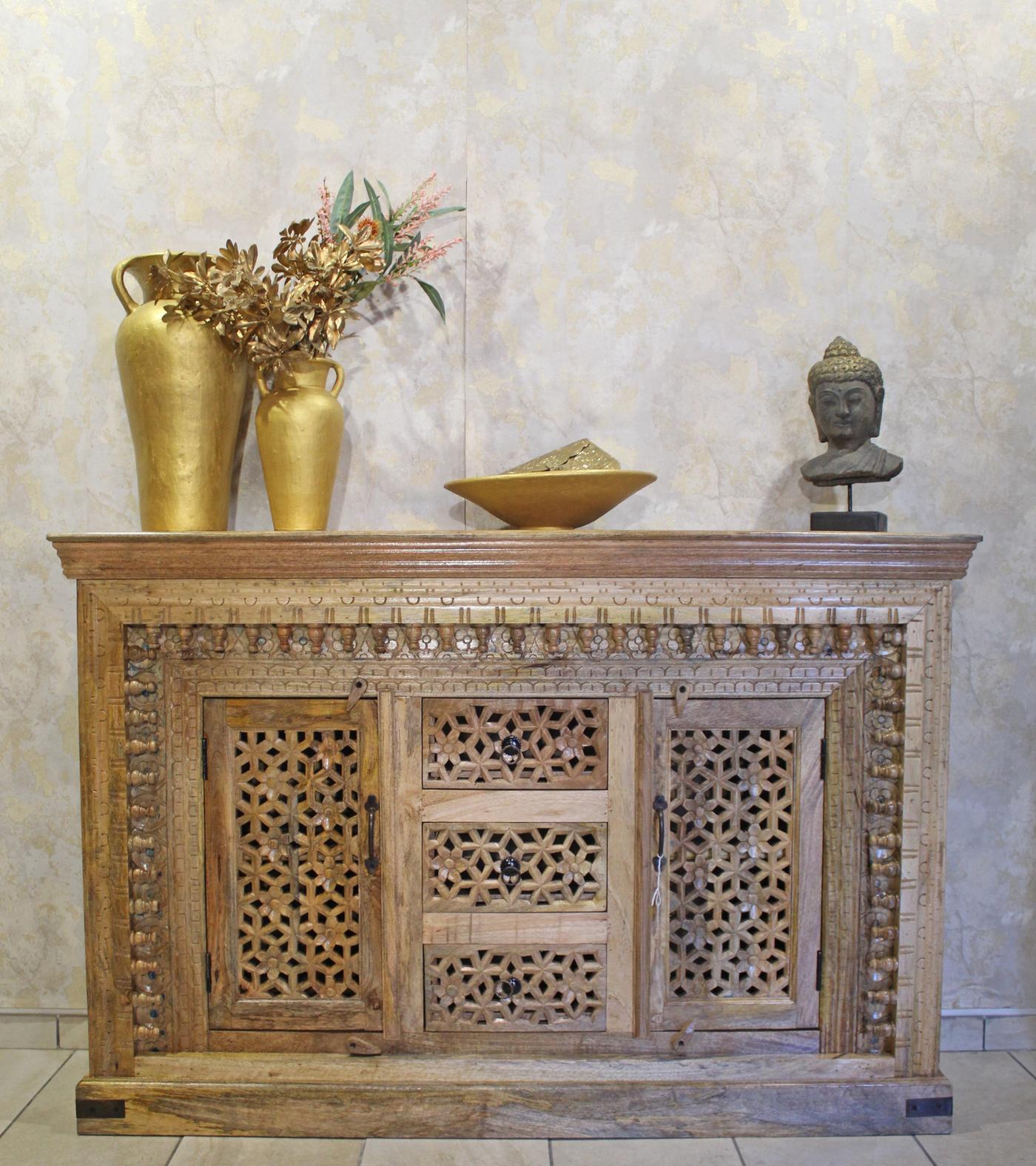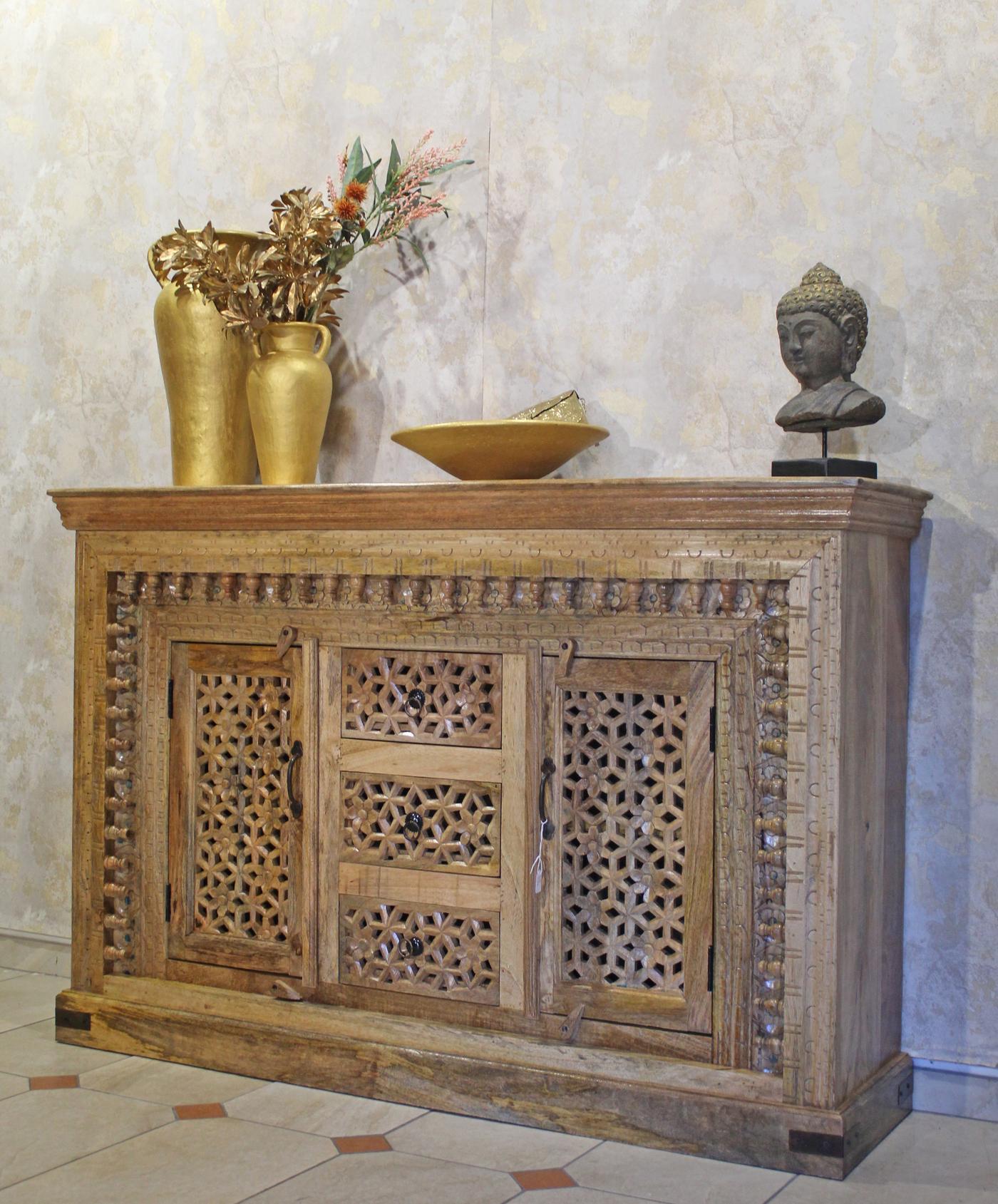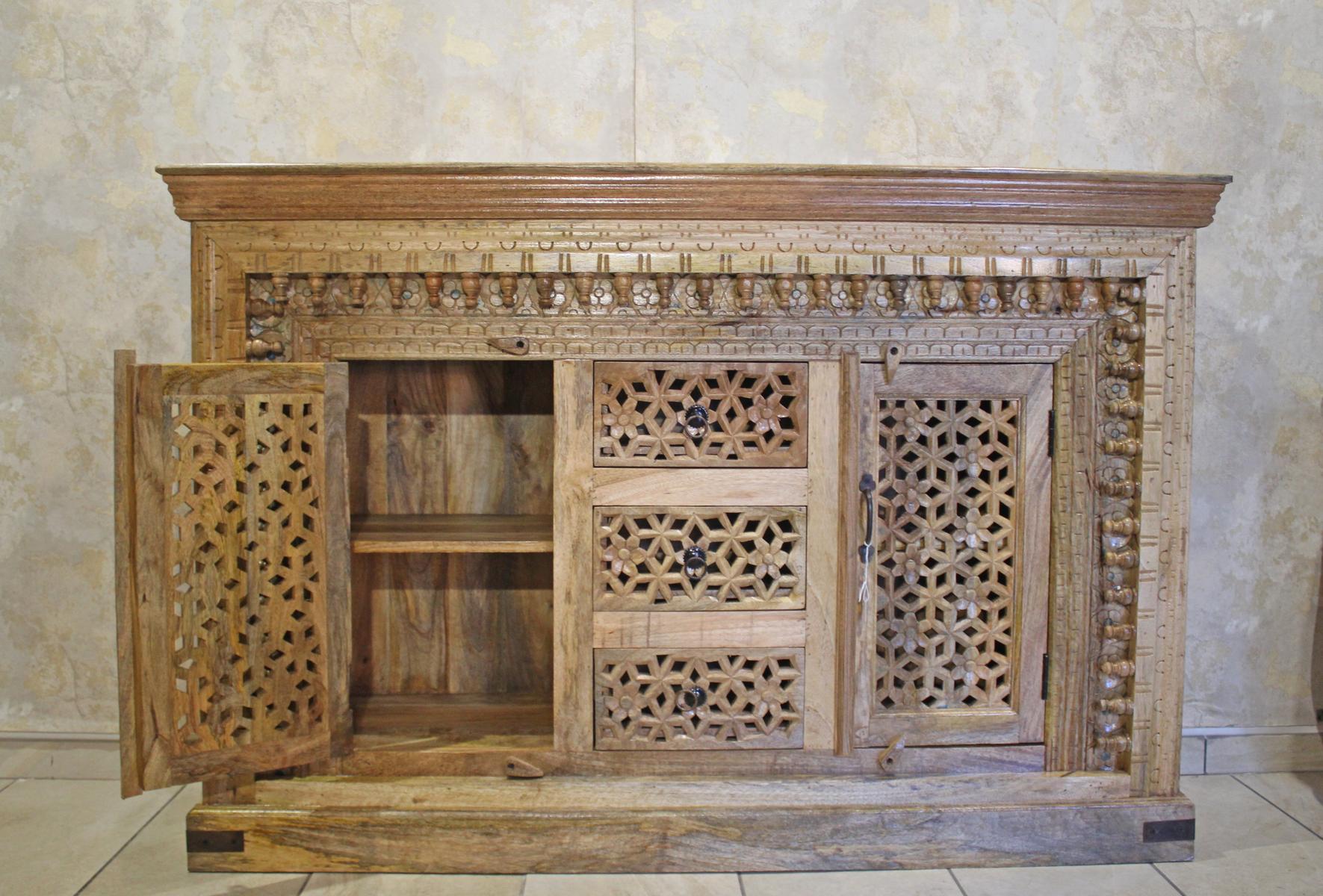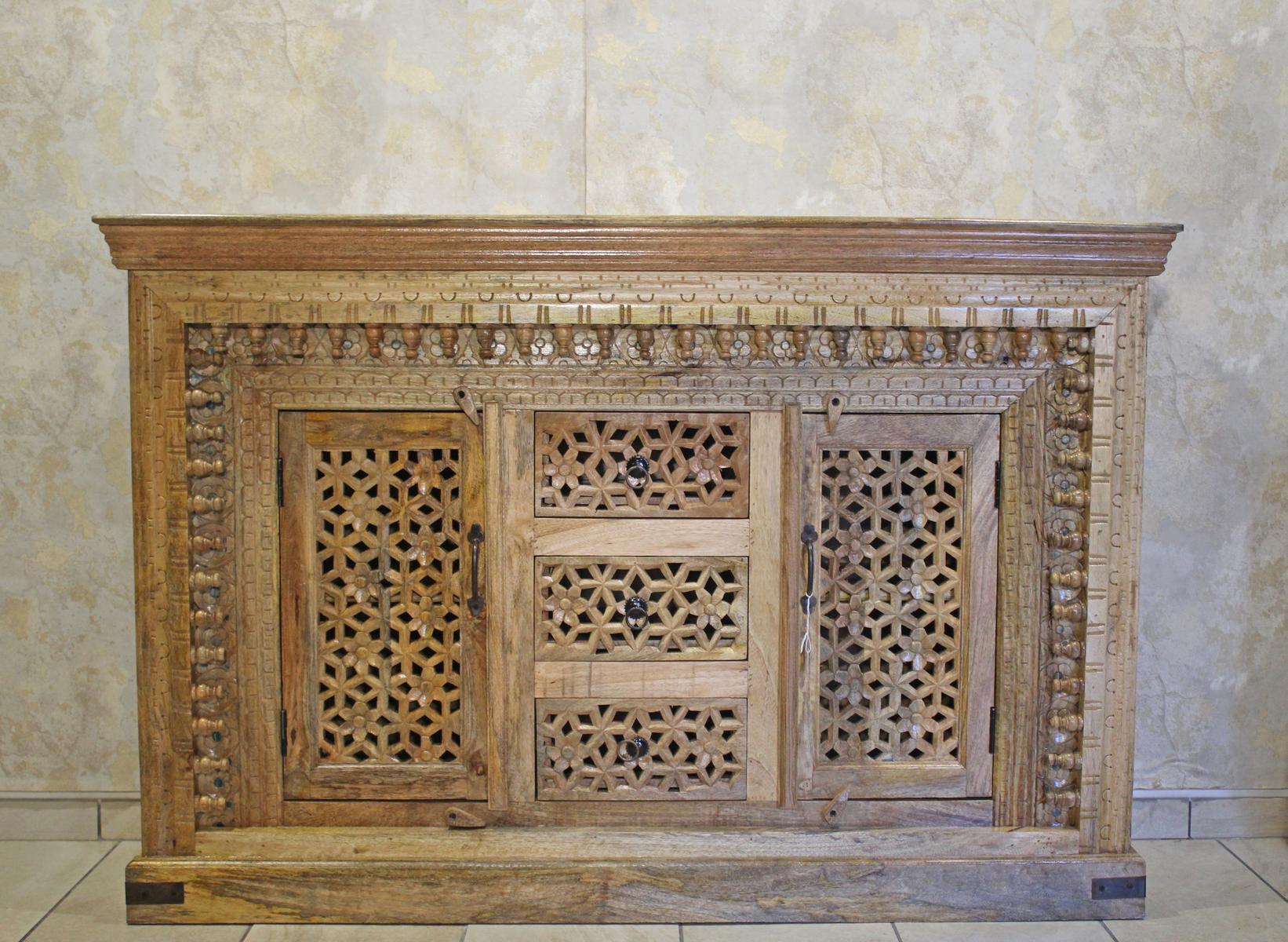Credenza indiana a due ante e tre cassetti, in legno intagliato lasciato al naturale con finitura lucida