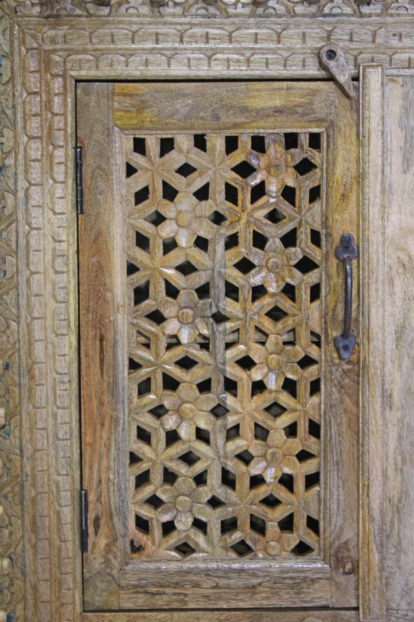 Tutto il mobile è avvolto da una ricca cornice, scolpita con cura e continuità lungo l’intero perimetro: una presenza decorativa forte ma armoniosa, che richiama l’estetica artigianale dell’India tradizionale.