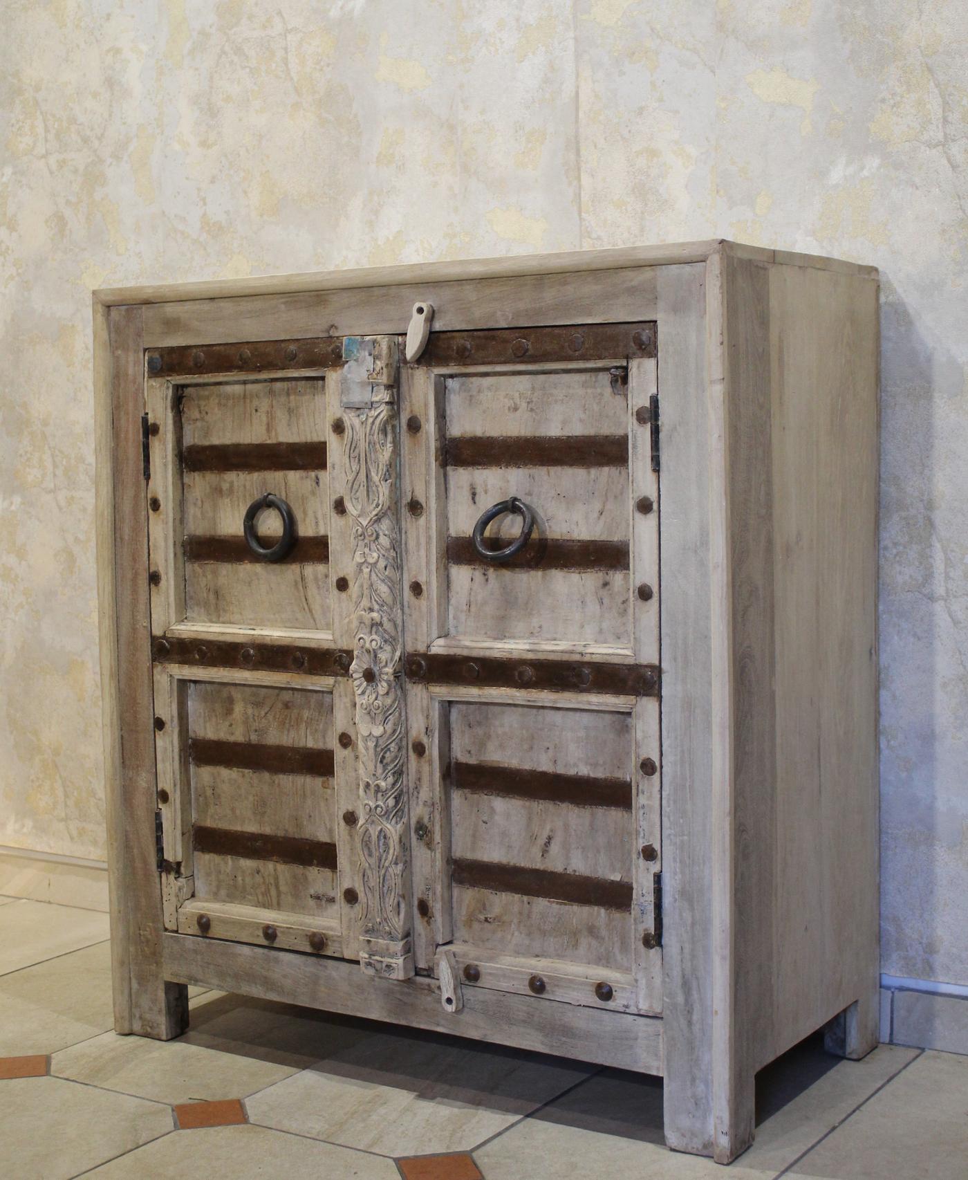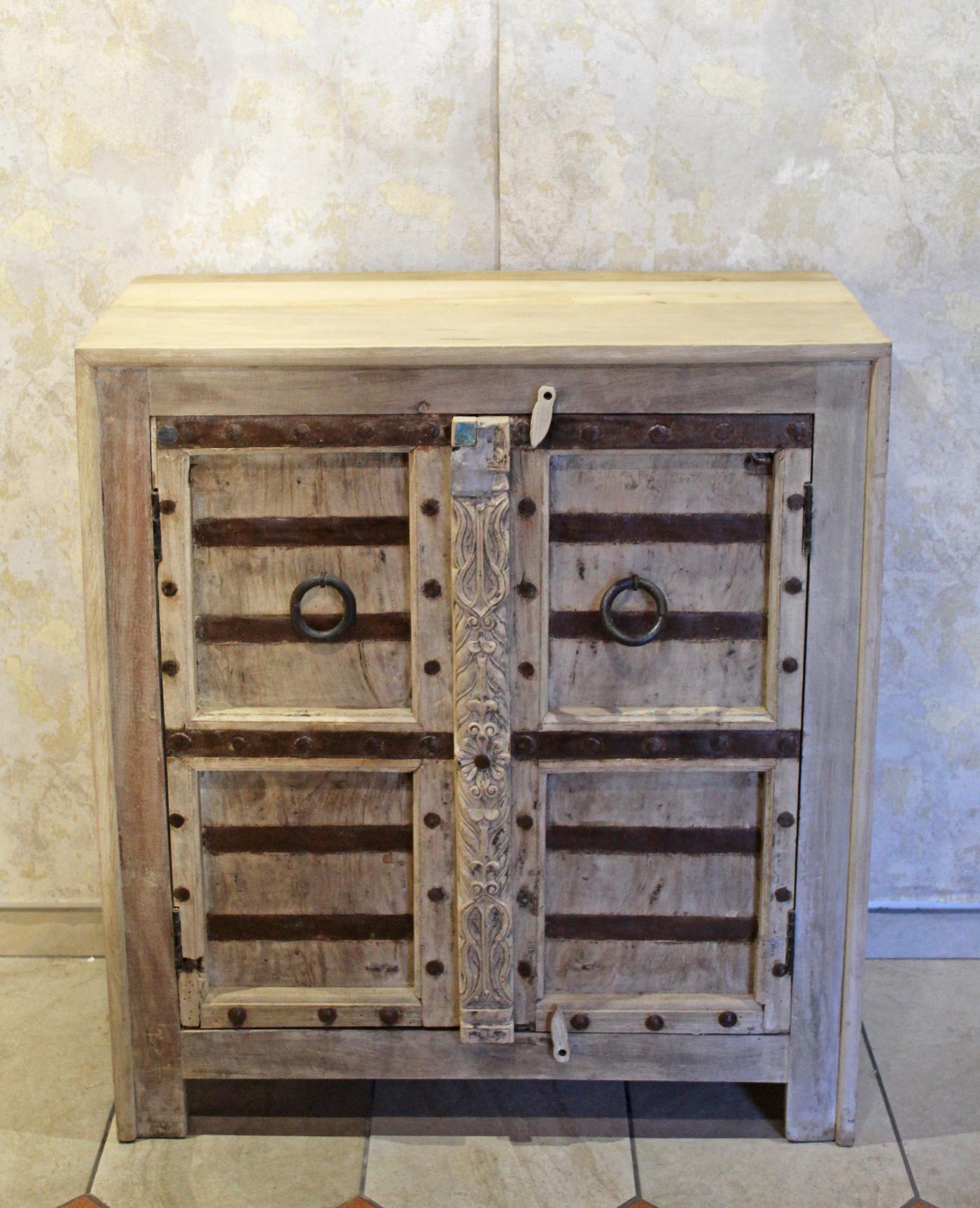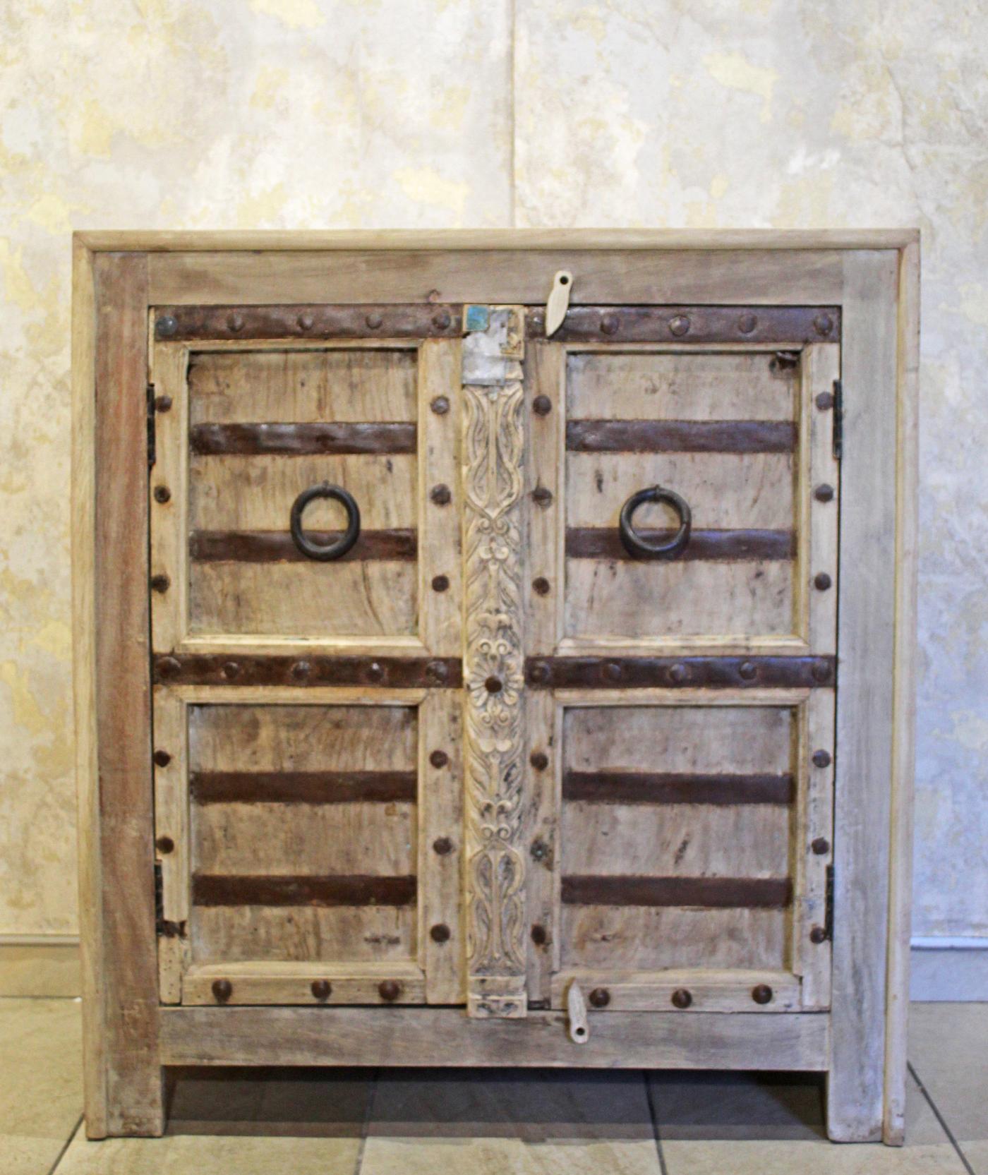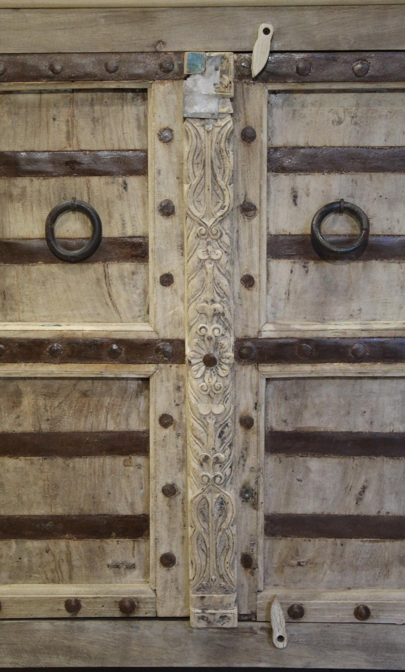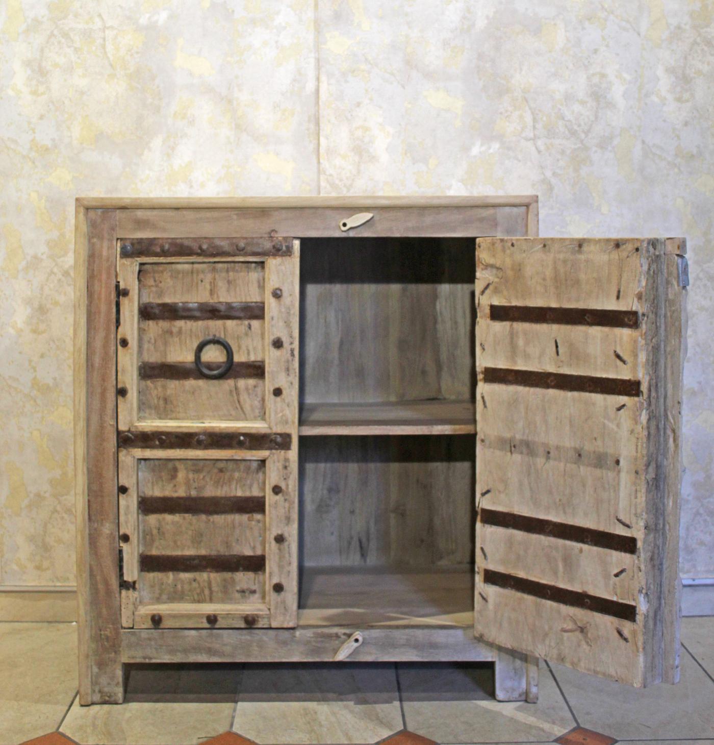 Credenza indiana a due ante, in legno schiarito con borchie e maniglie in ferro