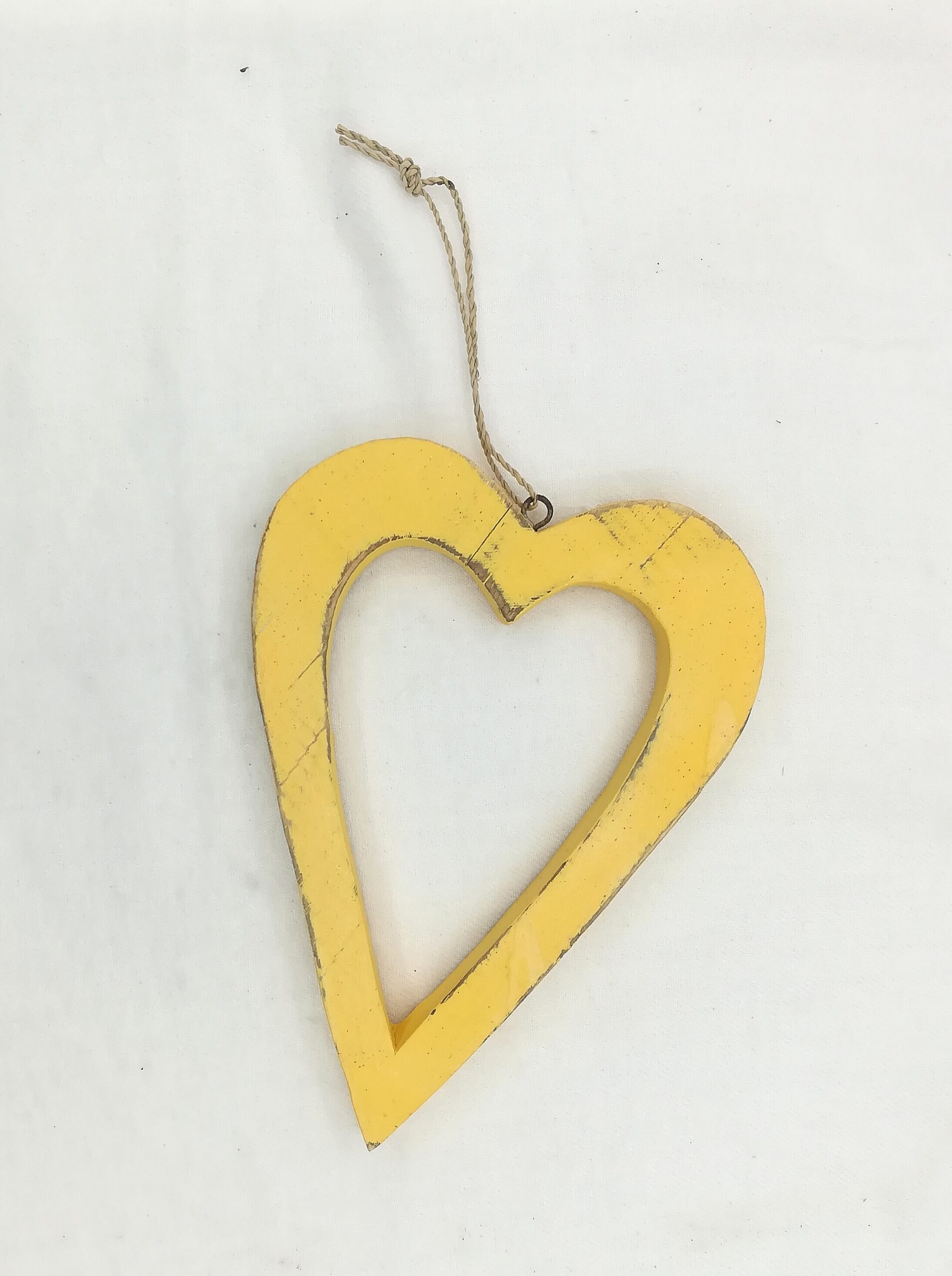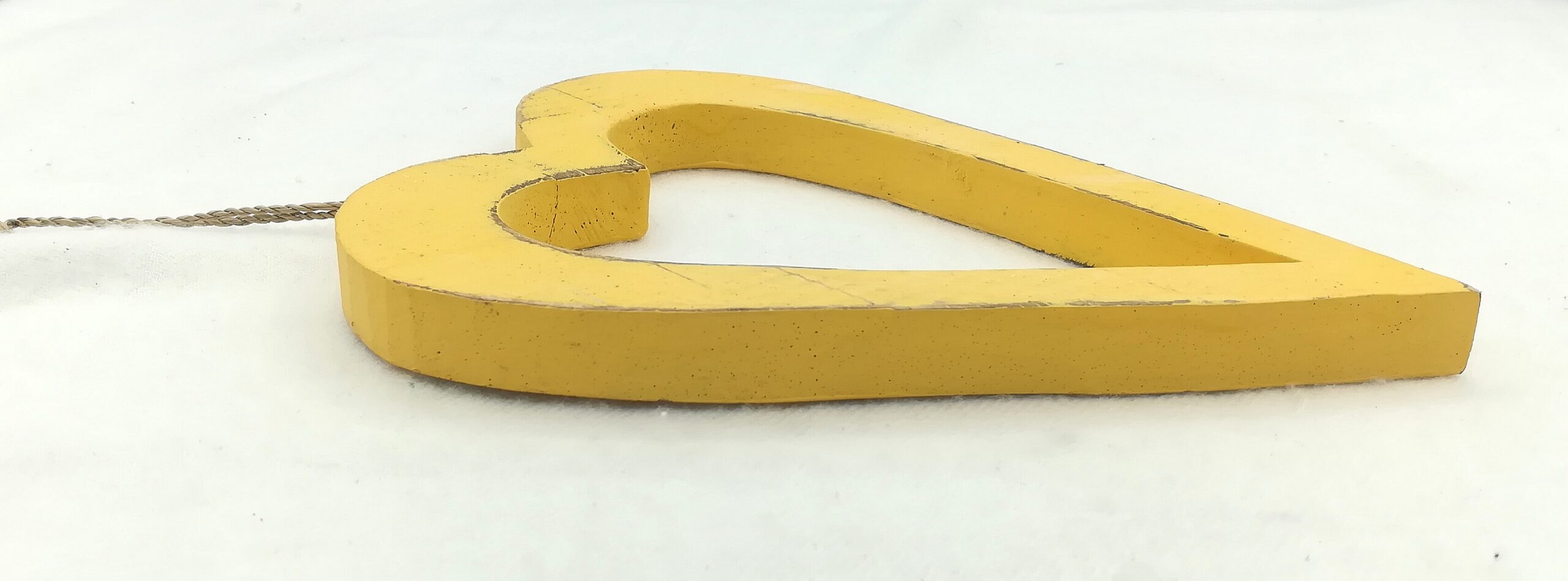 Cuore decorativo in legno,da appendere, di color giallo, realizzato in Indonesia