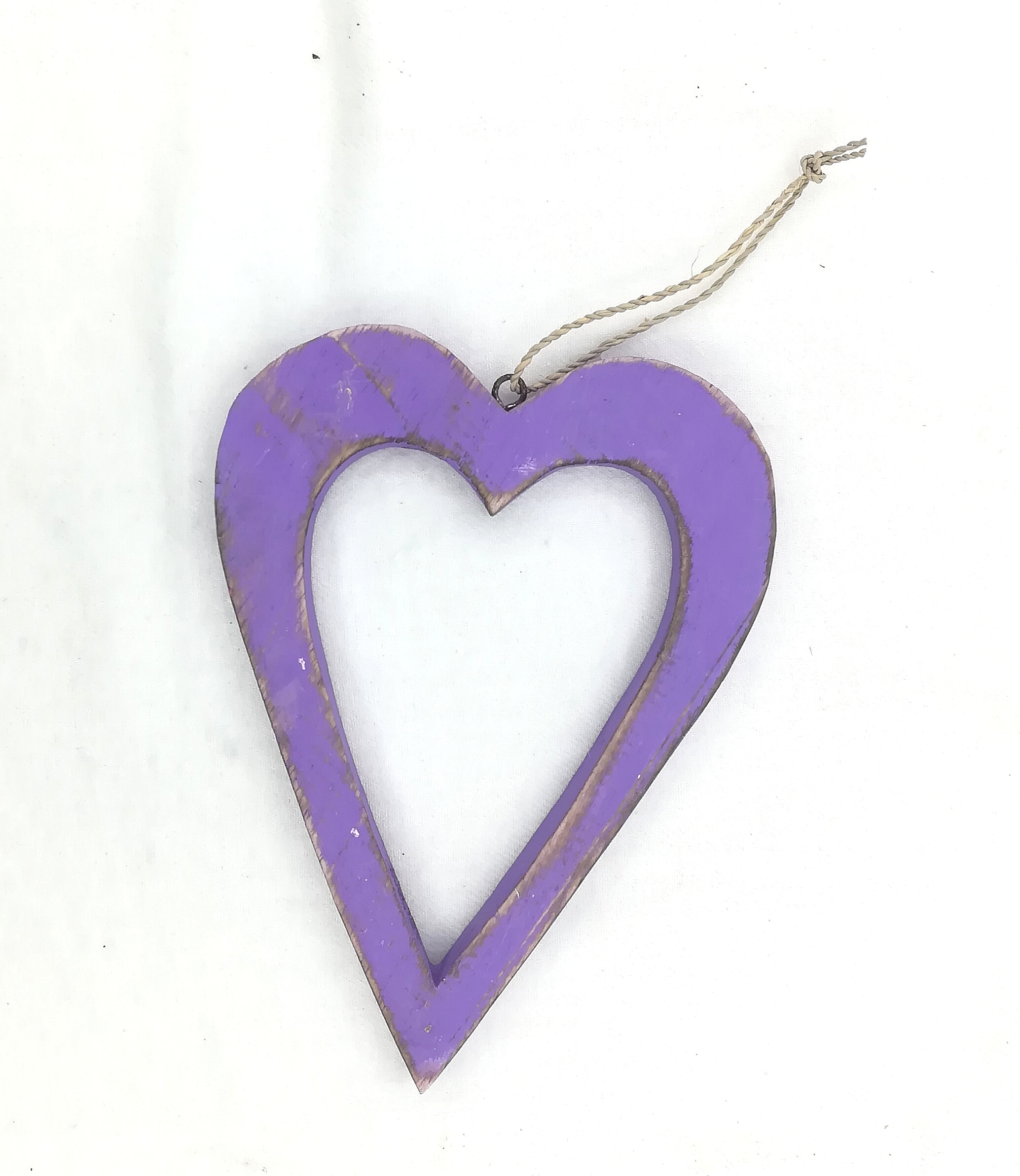 Cuore decorativo in legno,da appendere, di color viola, realizzato in Indonesia