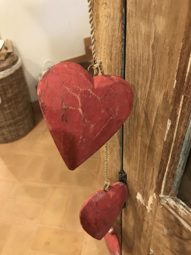 Filo di corda grezza realizzato in Indonesia,con attaccati 5 cuori in legno, di color rosso