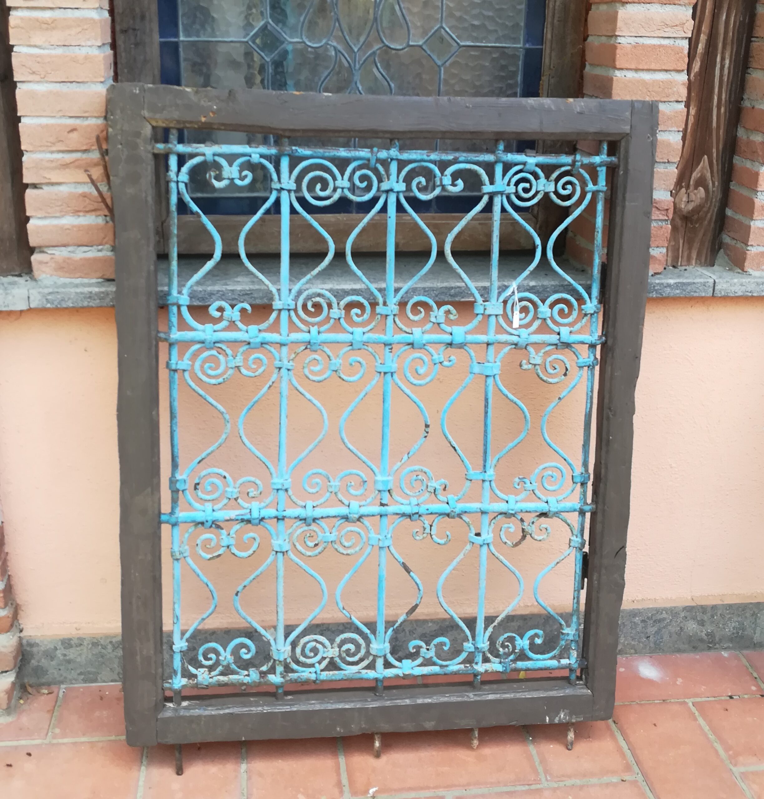 Finestra marocchina in legno e ferro battuto colorato di azzurro