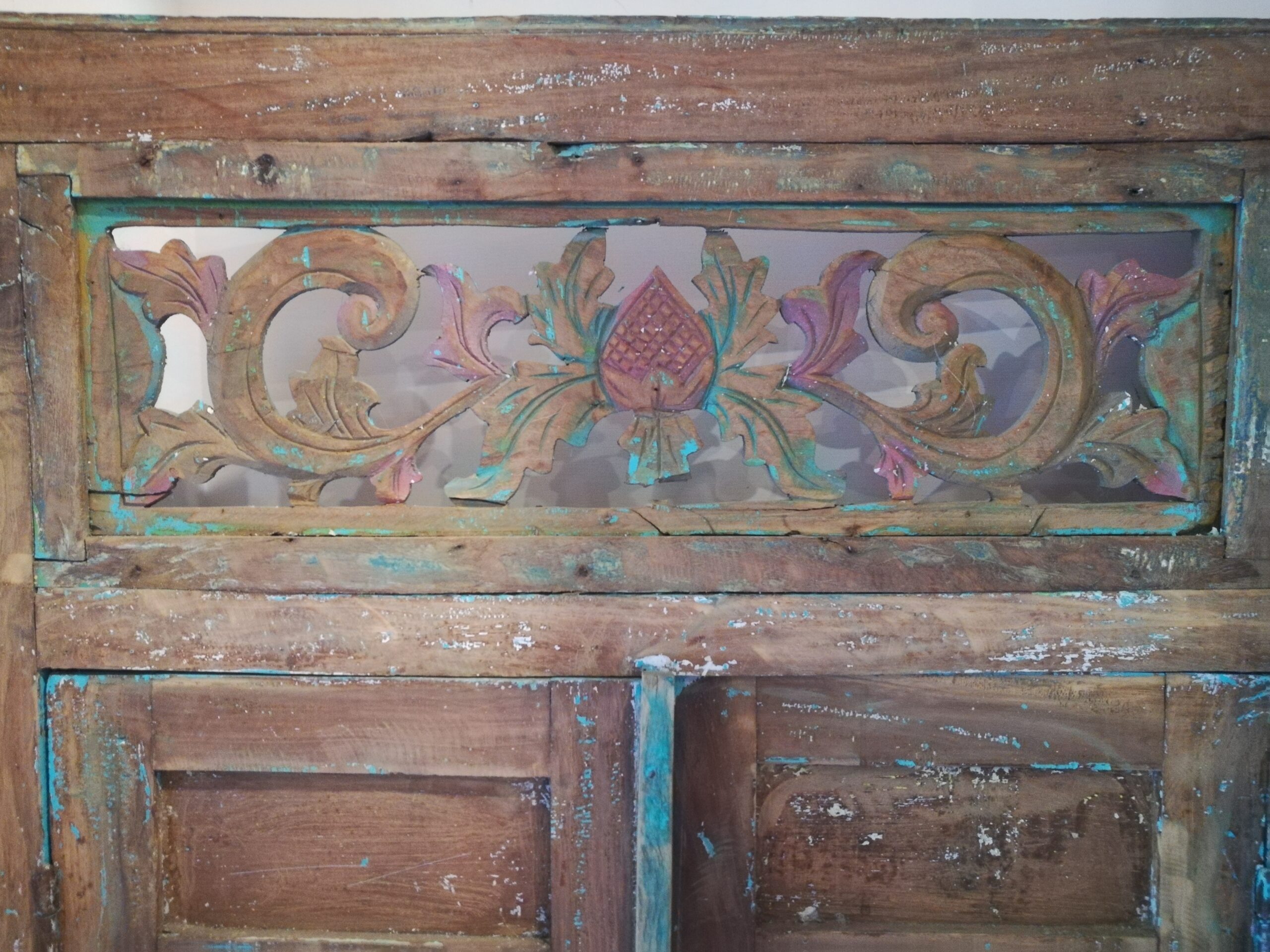 Il fregio decorativo nella parte superiore della finestra presenta intagli floreali leggermente sporcati di colore, che aggiungono un tocco di grazia e bellezza al suo design complessivo, riflettendo la tradizione artistica indonesiana, ricca di fascino e carattere.