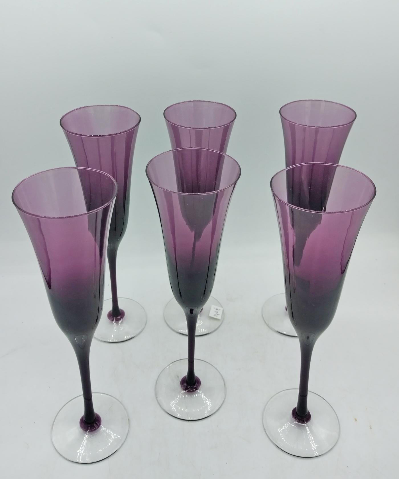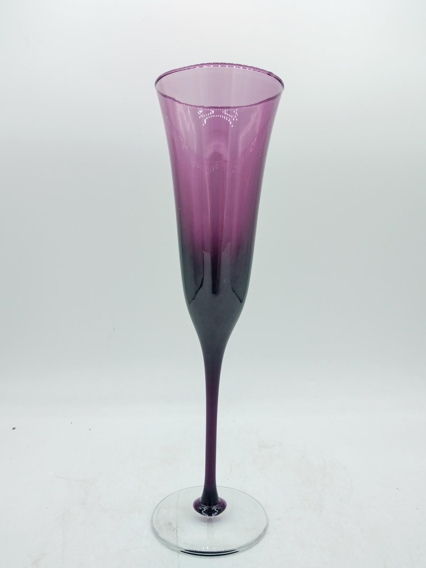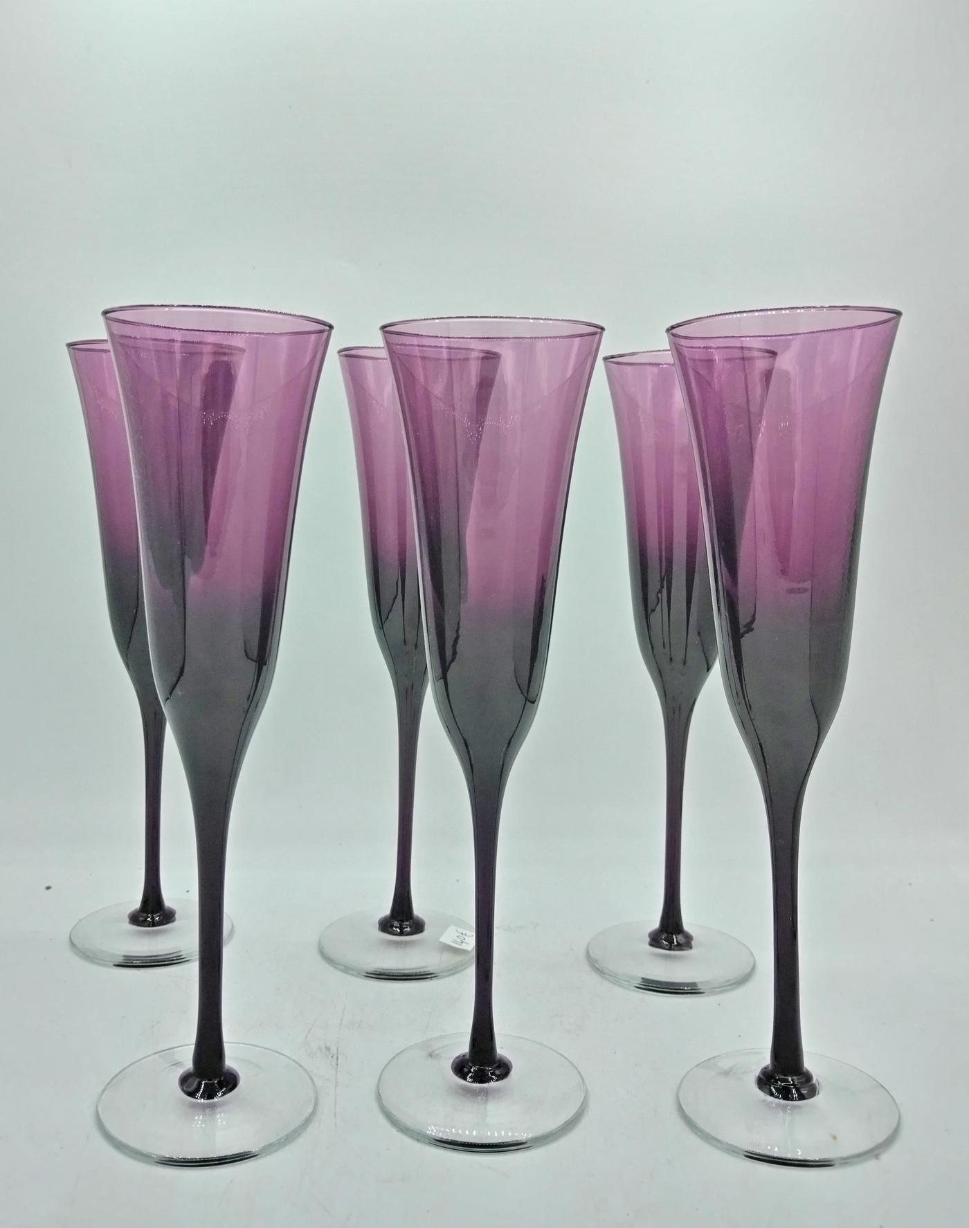 Il set comprende sei calici da champagne color viola con gambo molto sottile dalla forma semplice e lineare, classica e moderna al tempo stesso.