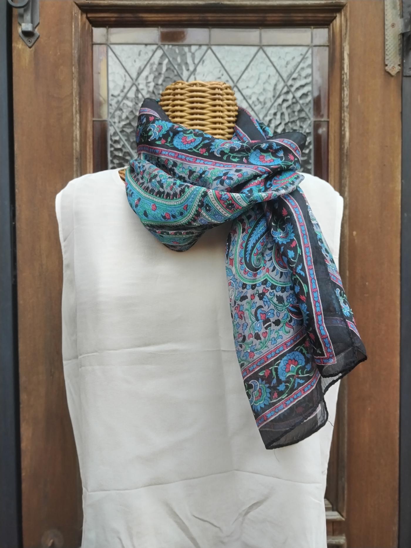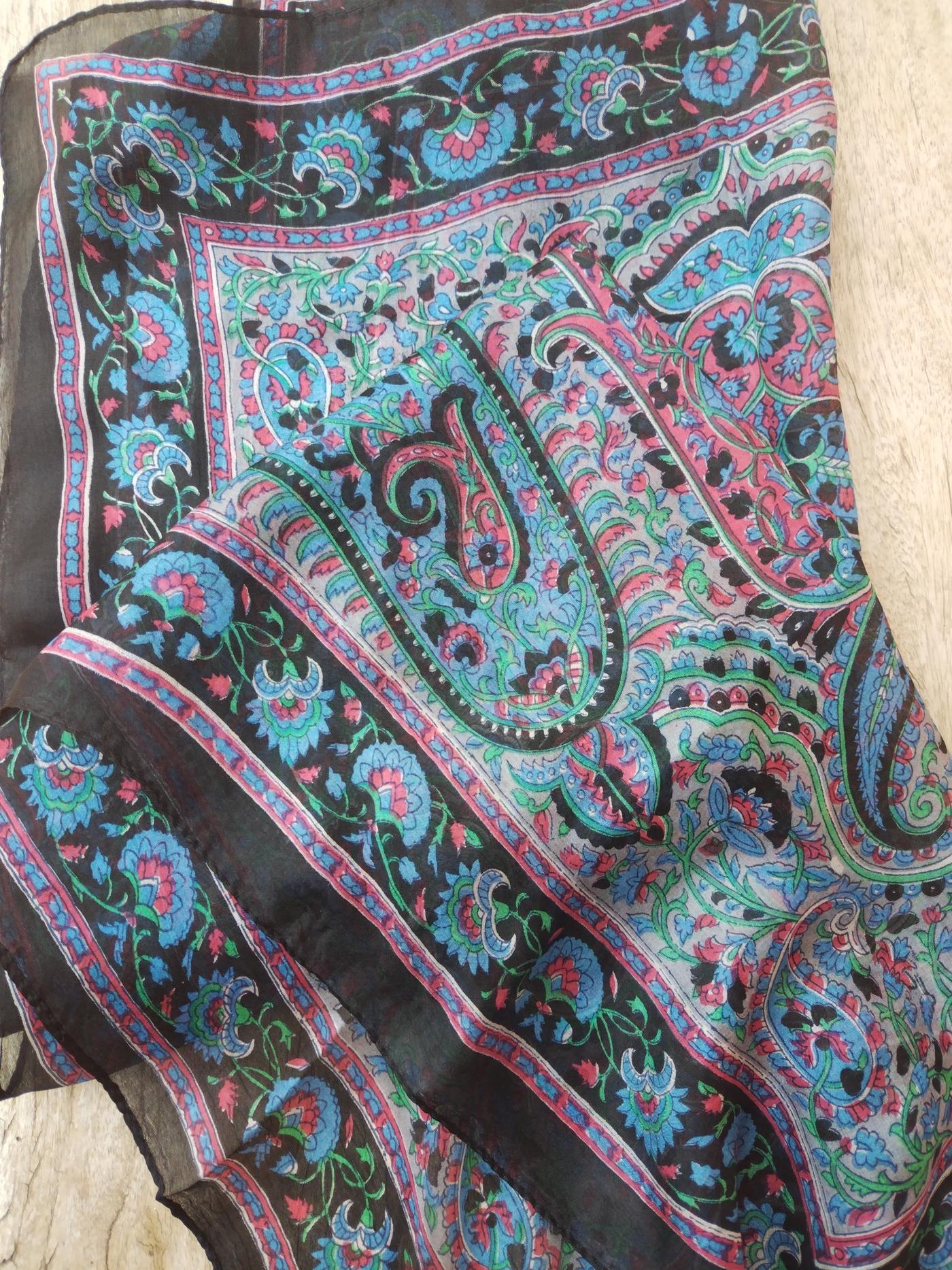 Foulard realizzato in India in seta con base nere e disegni cachemire in azzurro e rosa