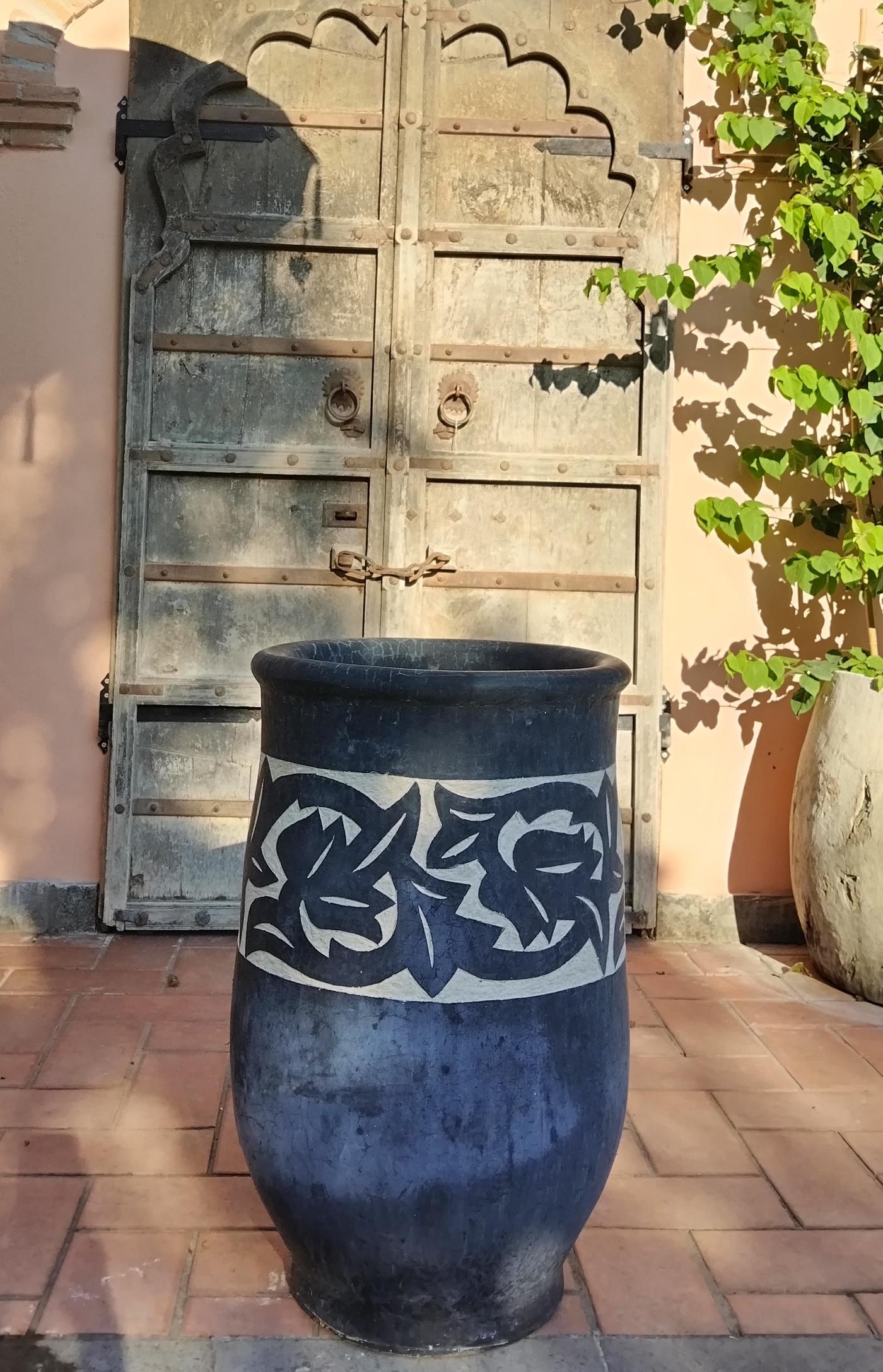 Oltre al materiale pregiato e tipicamente marocchino, la bellezza di questa giara sta nella decorazione floreale che adorna la parte superiore, un’incisione raffinata di fiori stilizzati che danno movimento giocando sui toni bianchi e neri del vaso.
