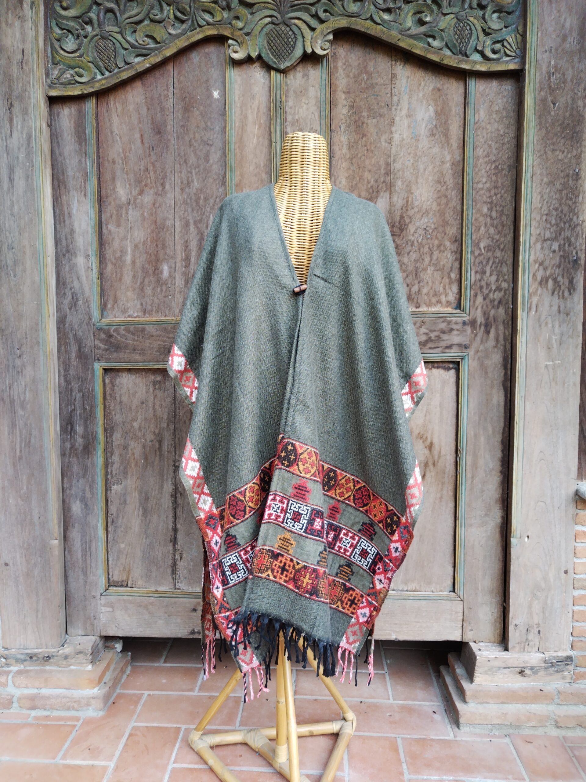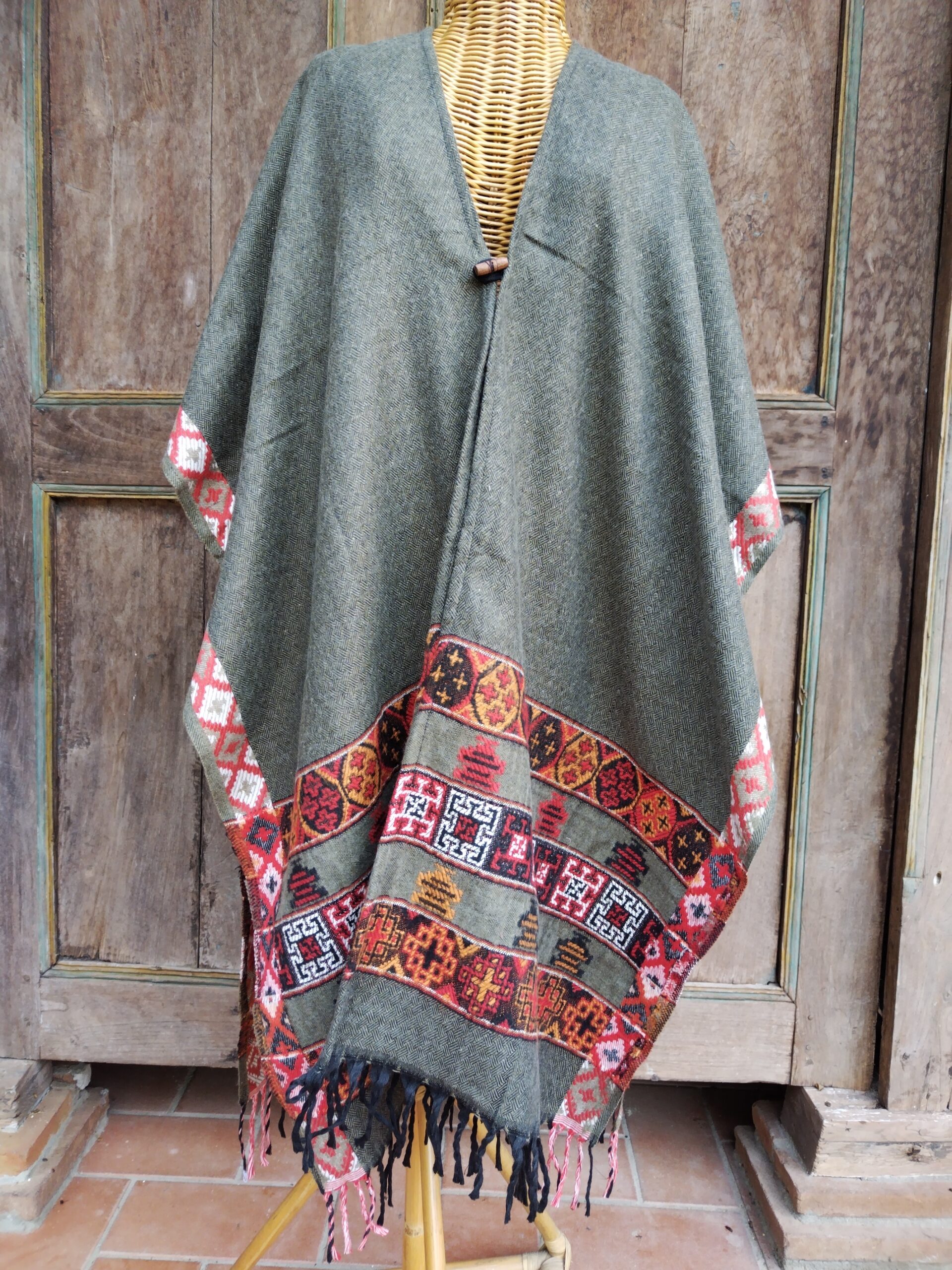 Poncho tinta unita color verde con decori realizzato in India in lana