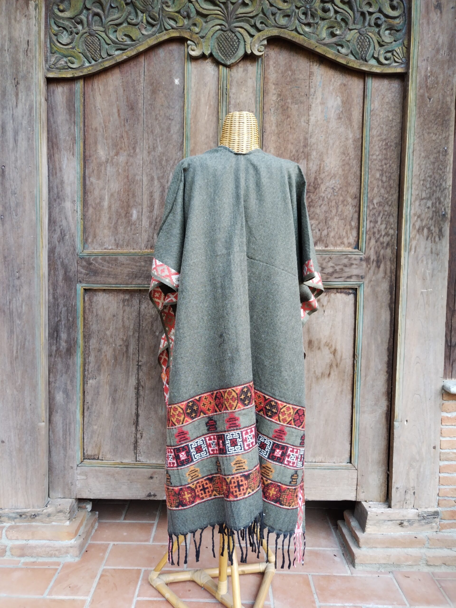 La bellezza di quest’abito è proprio nel decoro tradizionale che arricchisce lo stile sobrio e classico di questo poncho e nel suo taglio dritto, che lo rende perfetto sia per donne che per uomini, adatto a qualsiasi tipo di fisico, cadendo dritto lungo i fianchi.