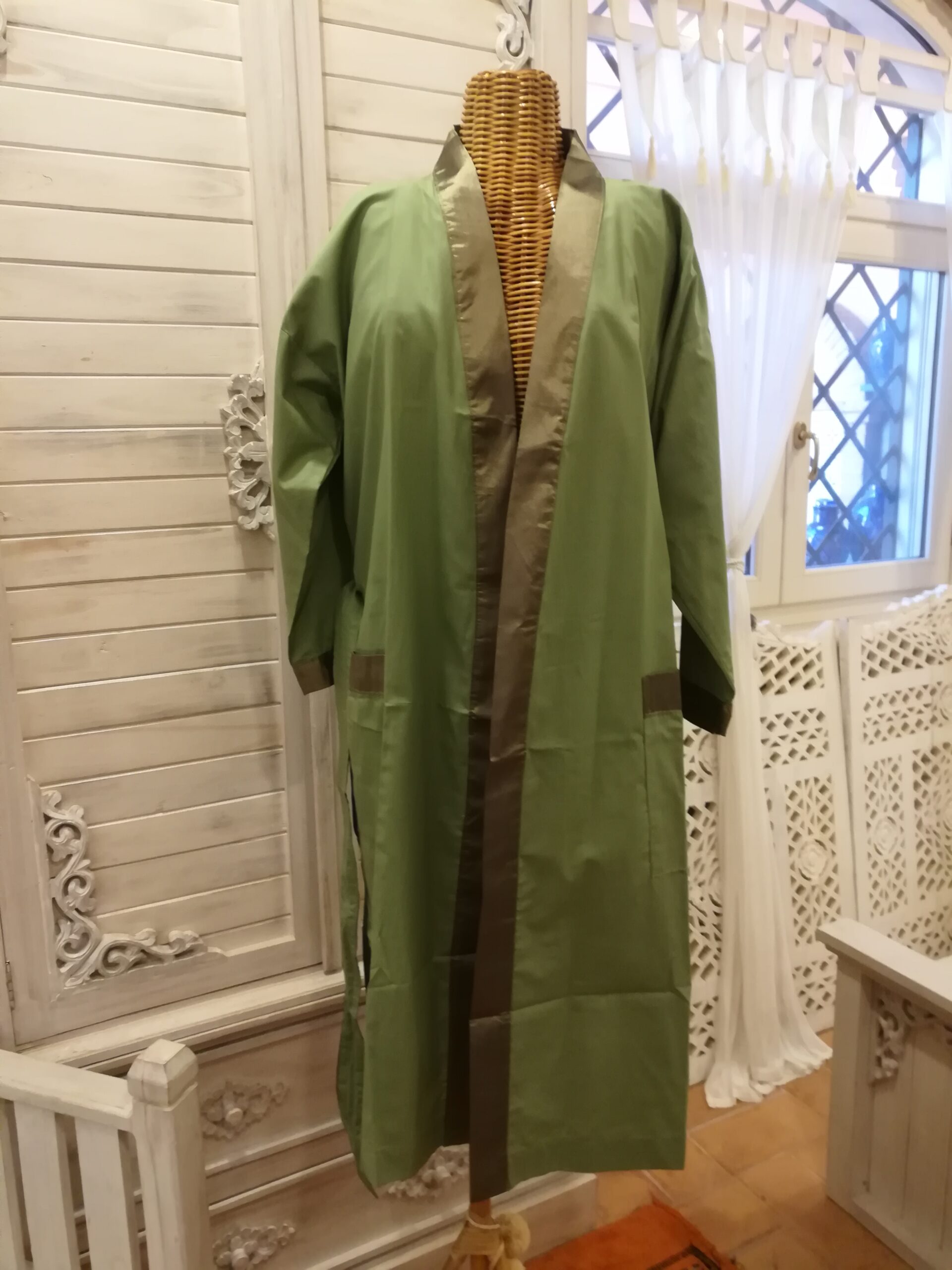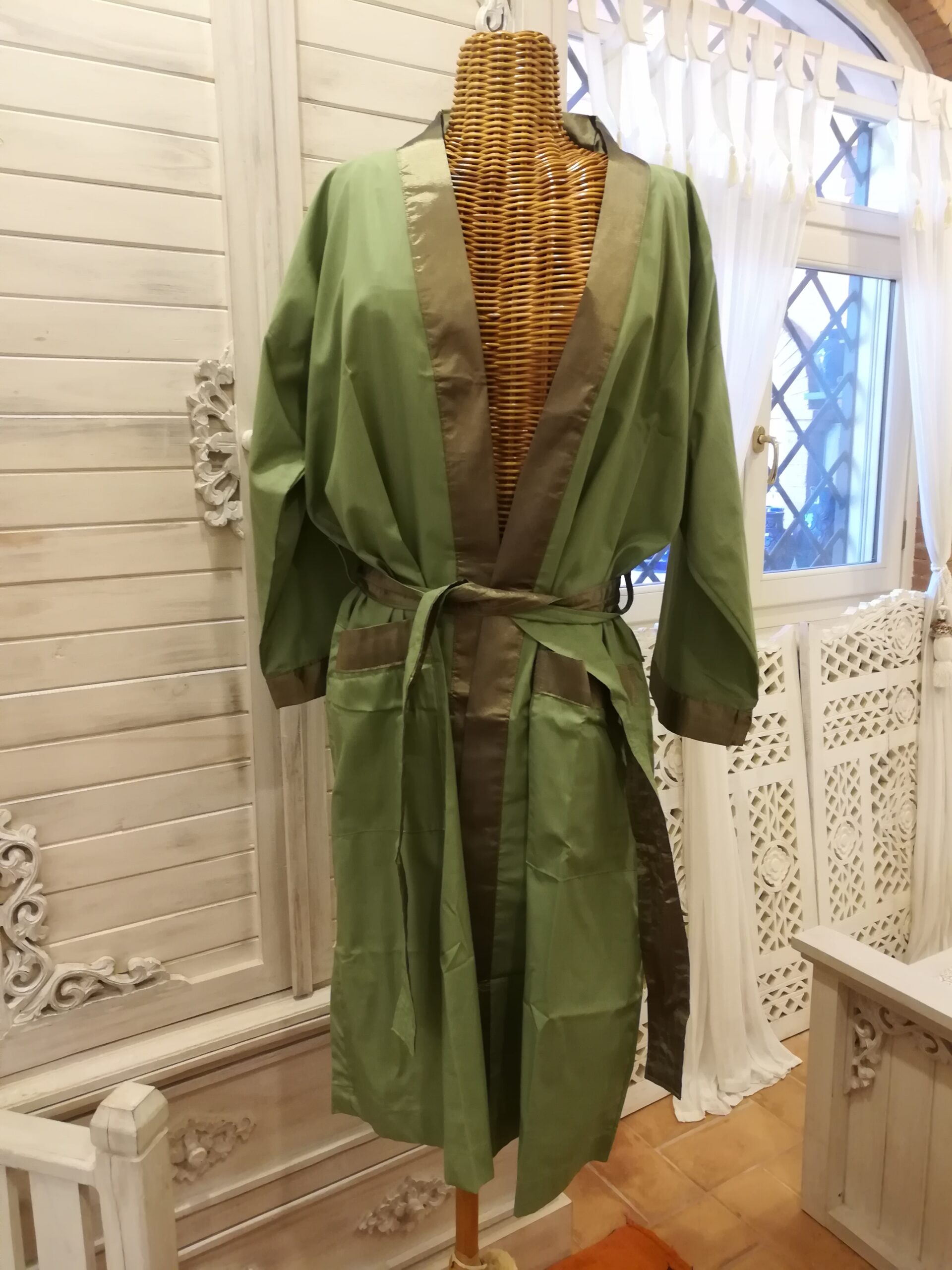 kimono in cotone con bordo, cintura e rifinitura delle tasche in raso, realizzato in Indonesia.