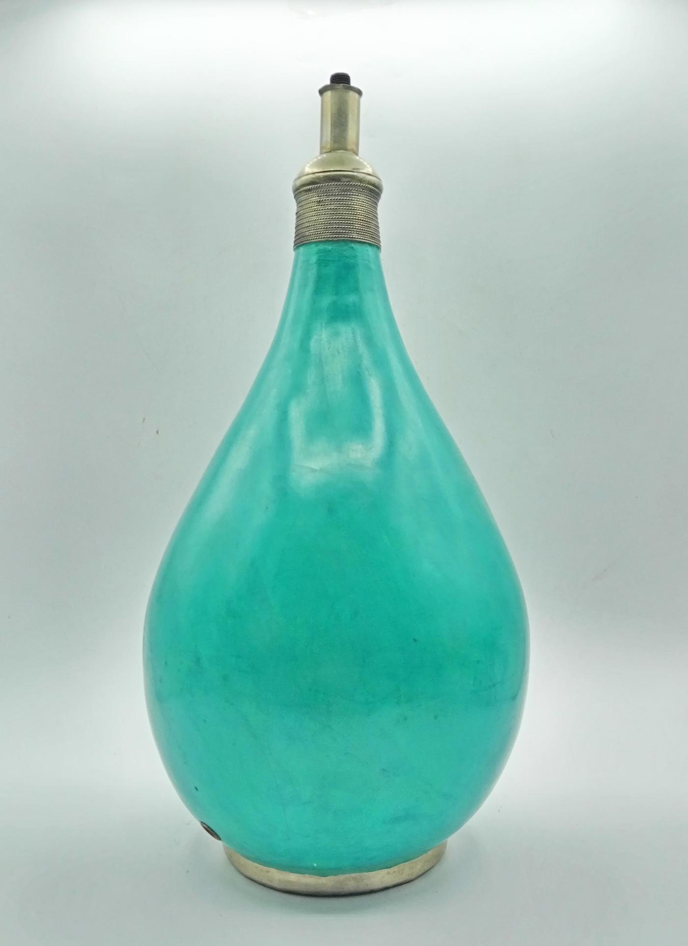 Lampada da appoggio turchese in tadelakt, lavorazione tipica marocchina che garantisce una superficie liscia ed opaca, con fascetta in argentone alla base e nella parte sottostante la lampadina. Base da elettrificare.
