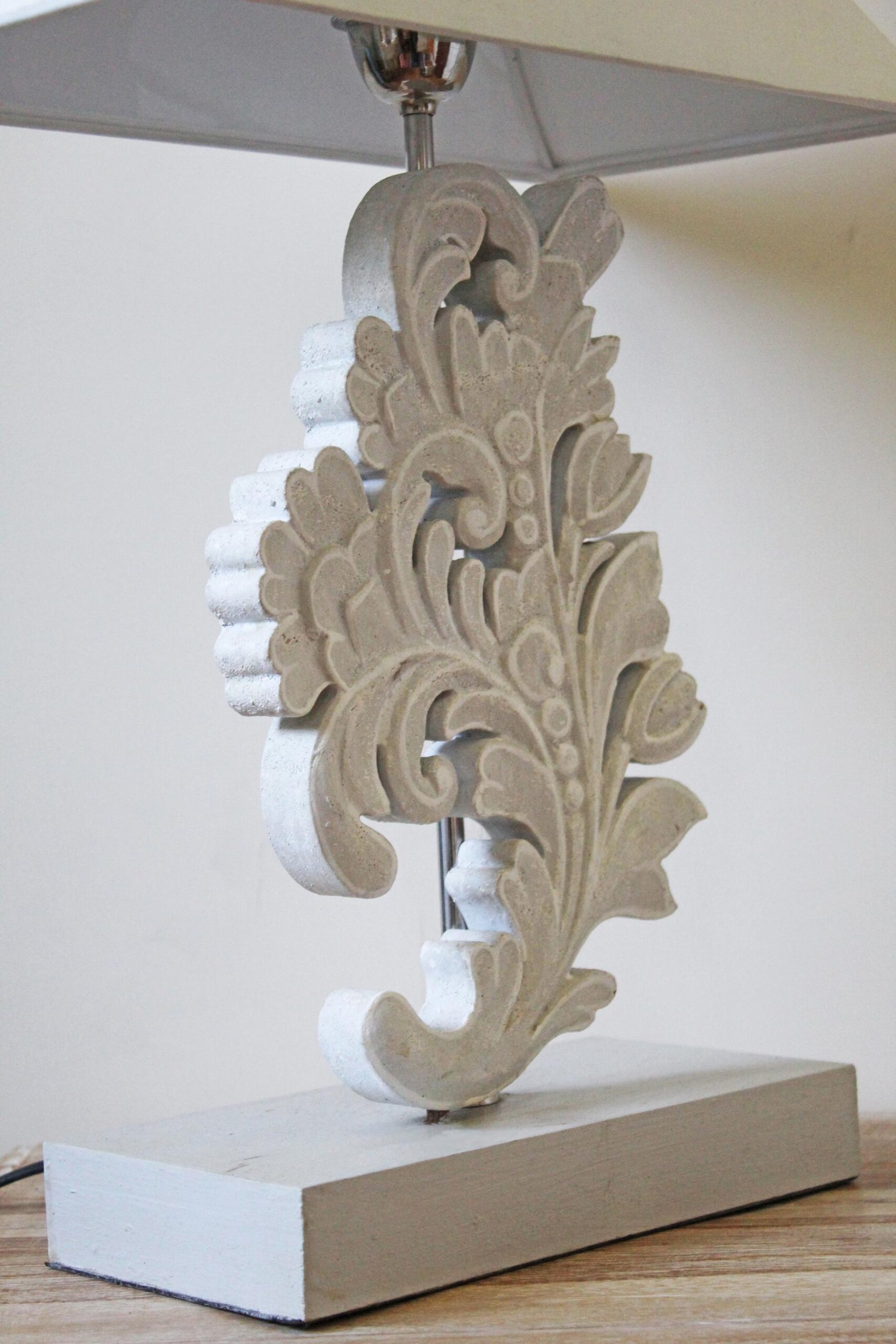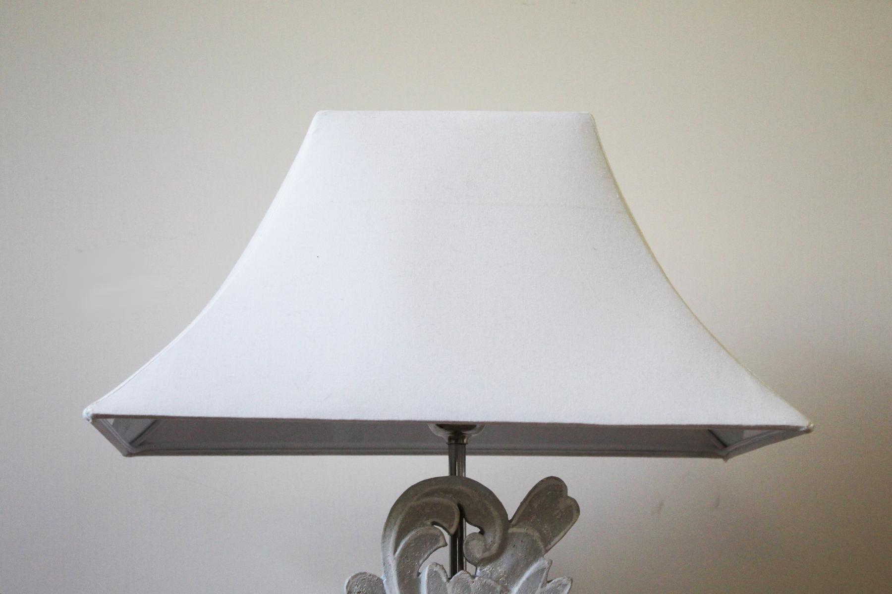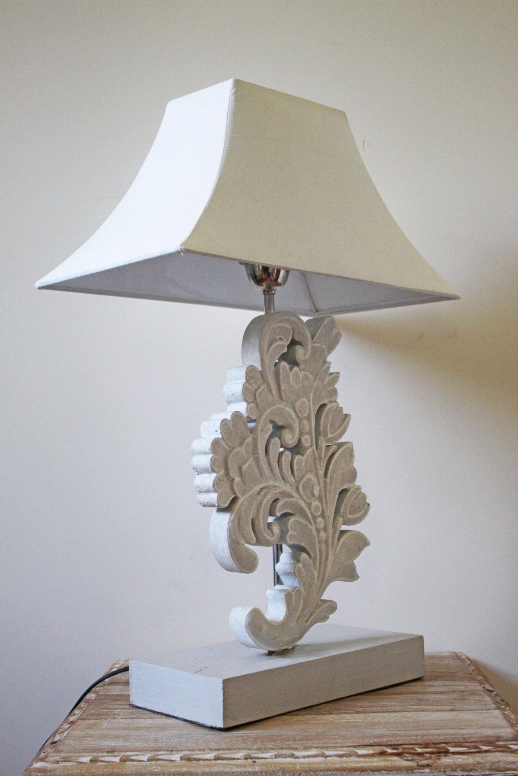 Ha una base rettangolare in legno grigio chiaro e paralume in cotone bianco a forma di pagoda.