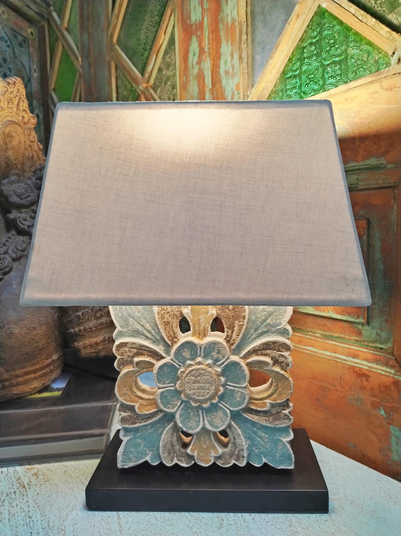 Lampada d’appoggio realizzata con un fregio quadrato in legno dipinto con intagli floreali sui toni del giallo, bianco e azzurro, prodotta in Indonesia, il paralume può variare di colore e forma