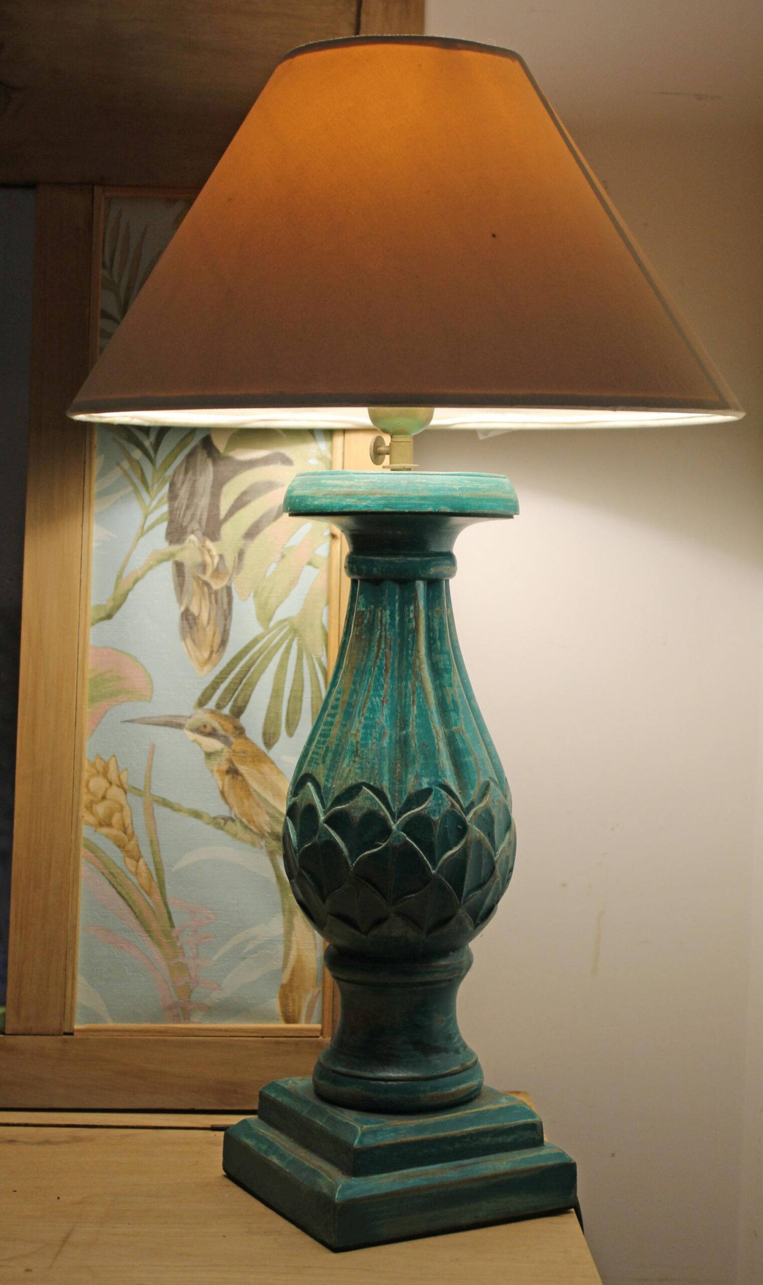 La lampada pigna è realizzata in Indonesiana da abili artigiani locali, partendo da un unico blocco di legno, scolpito con decorazione centrale a forma di pigna, con base quadrata.