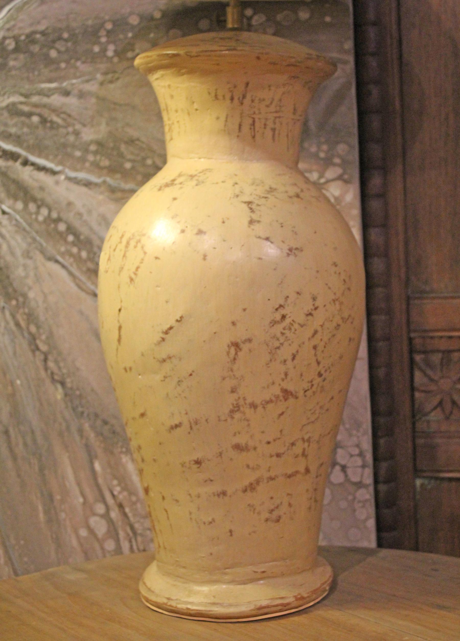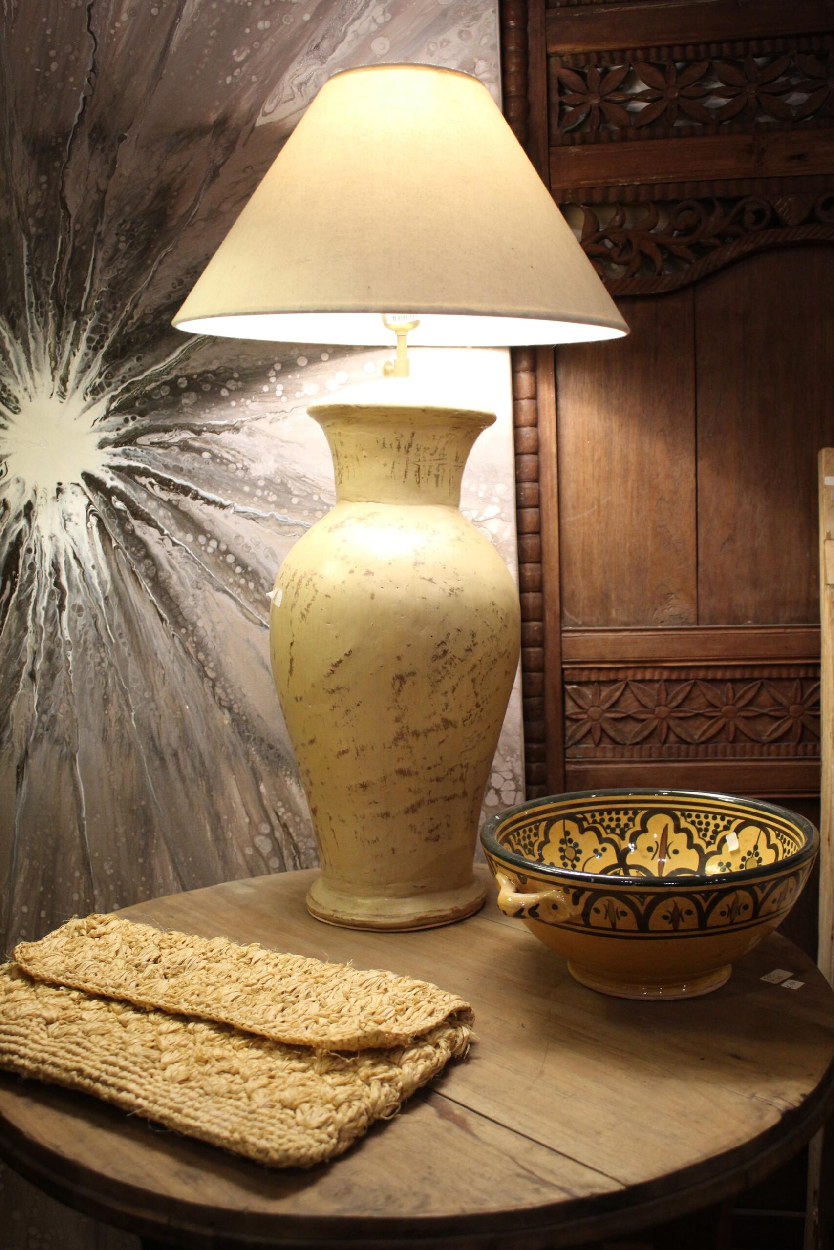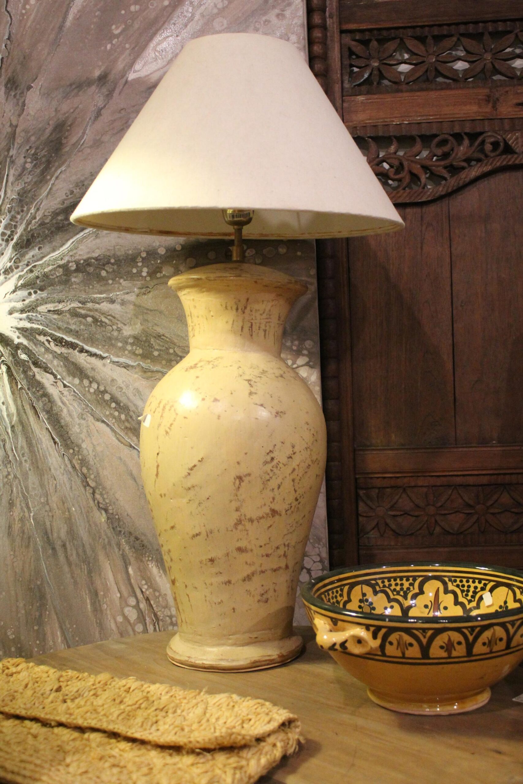 Lampada indonesiana in terracotta liscia decapata crema, con paralume color panna.