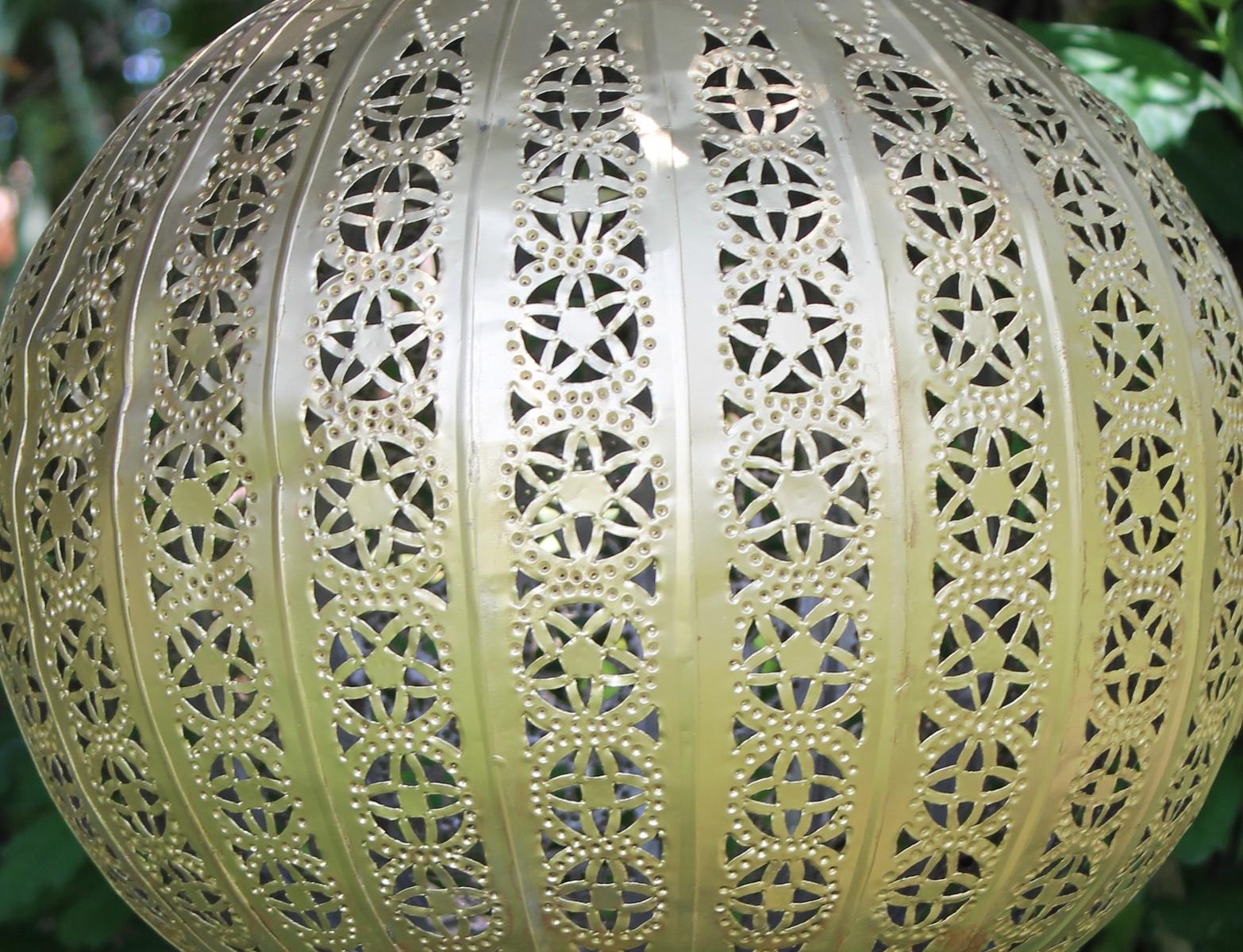 Questa grande lampada dalla forma tondeggiante con la sua tonalità luminosa aggiunge un fascino tipicamente orientale agli ambienti e l’effetto della luce che passa attraverso le forme geometriche traforate, crea un’atmosfera avvolgente, che trasforma qualsiasi ambiente.