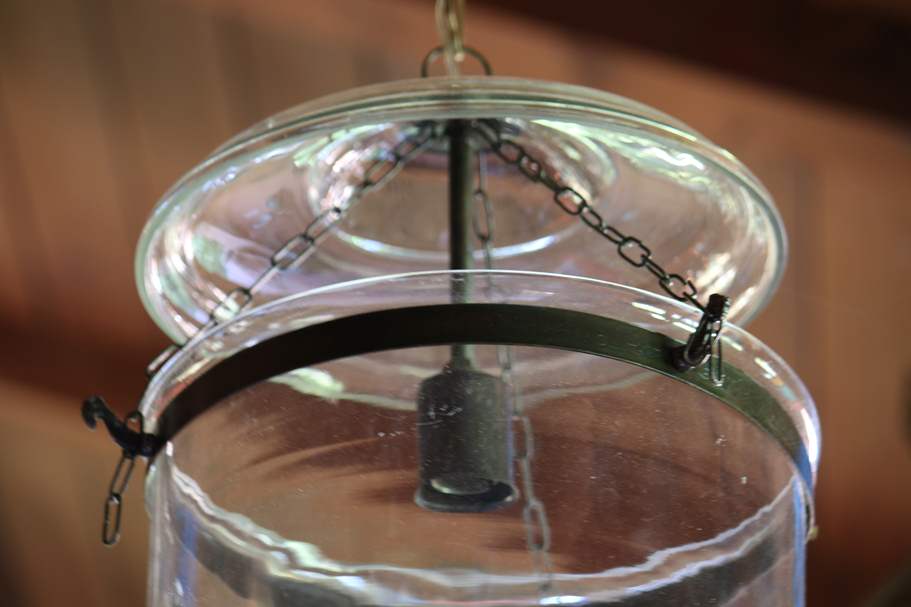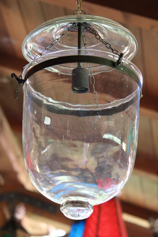 Lampadario indiano in vetro trasparente a forma di coppa con un coperchio in vetro trasparente sorretto da catene regolabili.