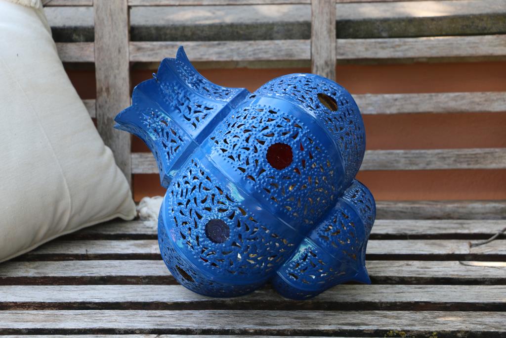 Lampada marocchina dalle forme sinuose realizzata in latta dipinta di blu, traforata con motivi geometrici e decorata con specchietti colorati