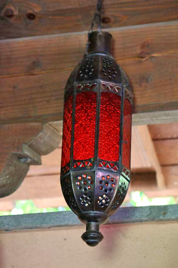 Le parti superiori ed inferiori sono in ferro brunito traforato, con vetro smerigliato rosso. Nell’ estremità superiore ha una catenella in ferro, che permette di appenderlo comodamente al soffitto o al muro.
