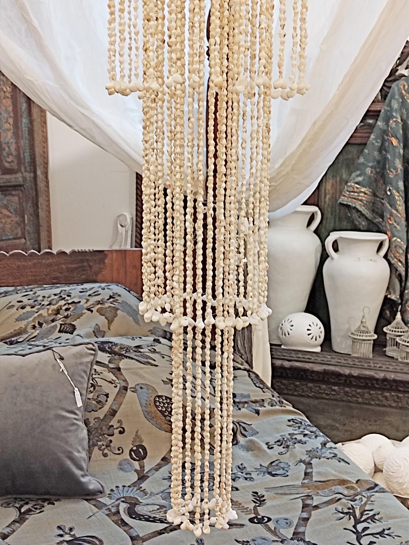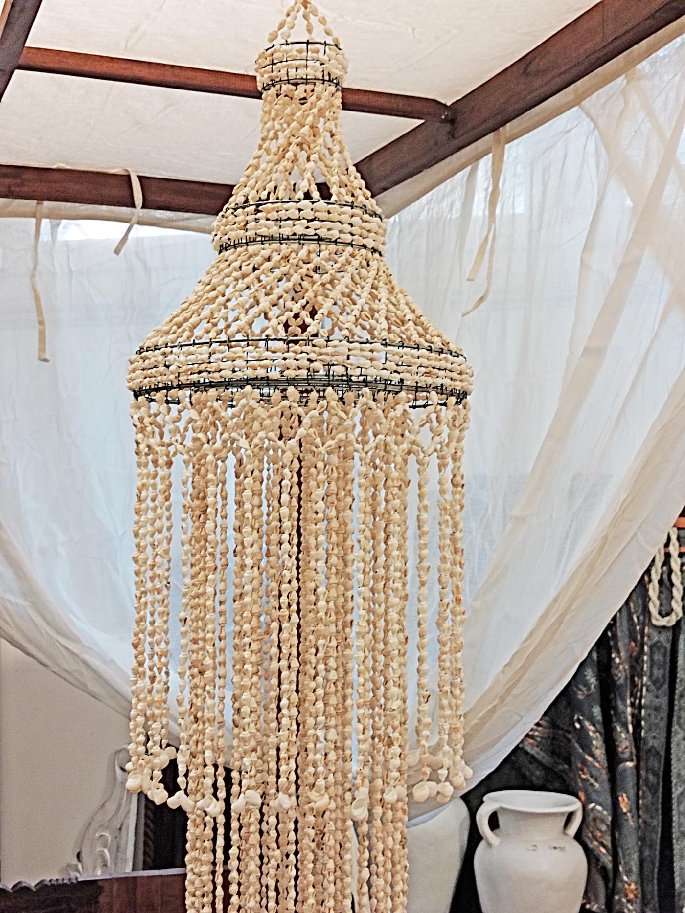 Lo immaginiamo in un locale dallo stile primitivo, sotto ad un patio accanto a dei divani bianchi o in una camera da letto dove poter godere dei giochi di luci ed ombre creati dalle mille conchiglie bianche.