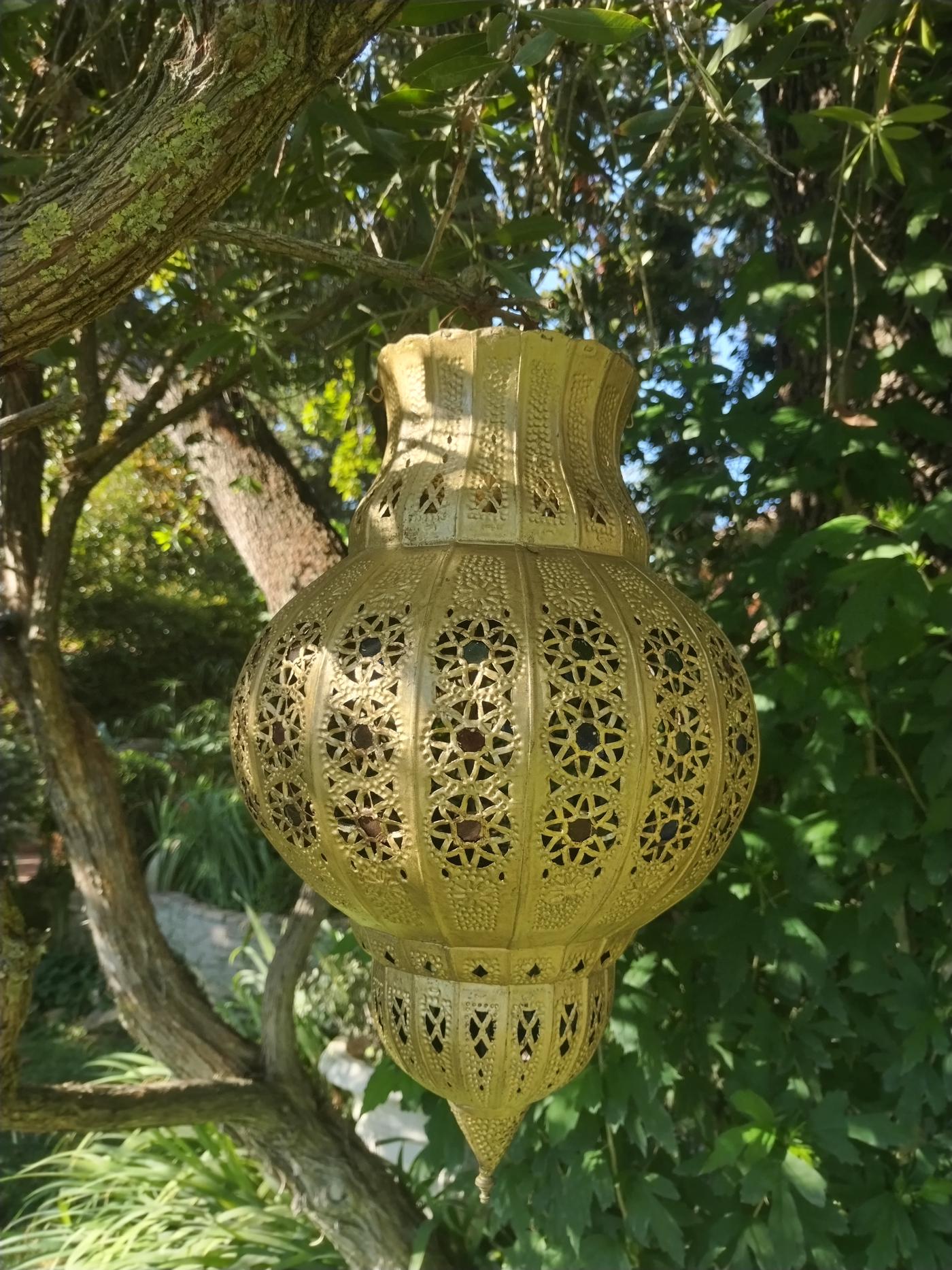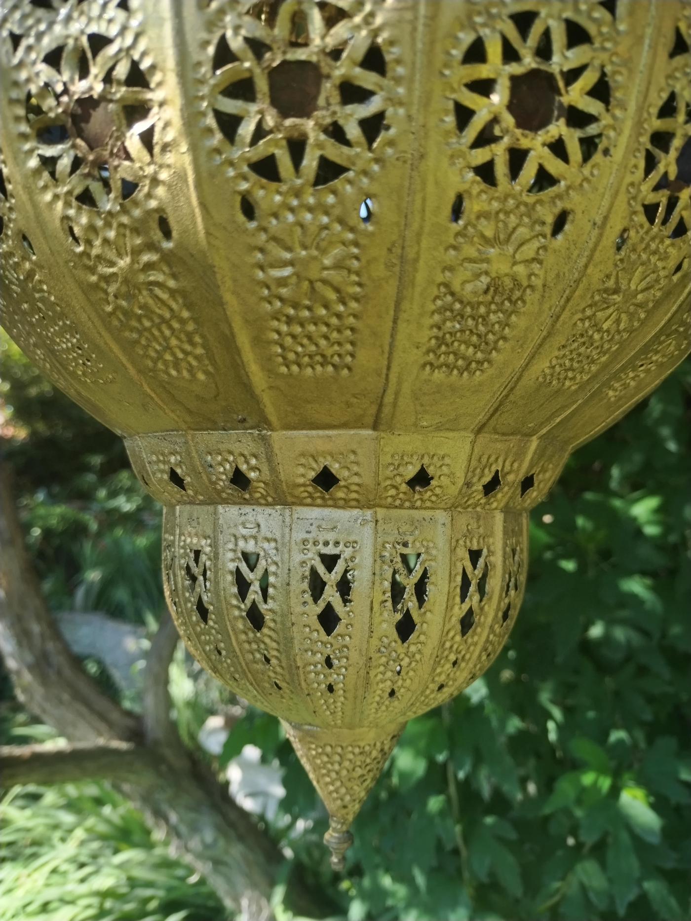 Lampada marocchina dalle forme sinuose realizzata in ferro dipinto color oro, traforata con motivi geometrici e decorata con specchietti colorati