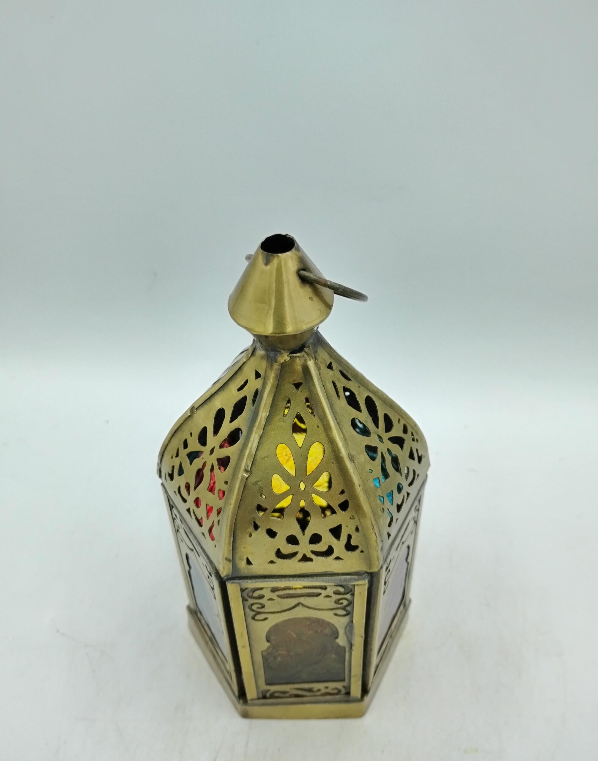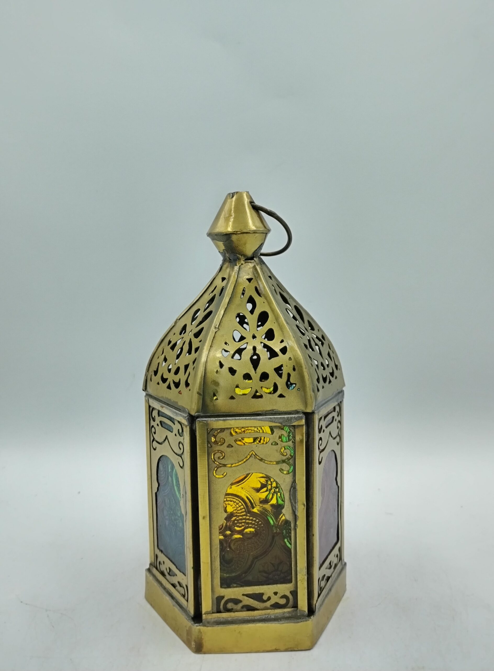 Lanterna porta candele marocchina, realizzata in ottone traforato con motivi geometrici e floreali e vetri colorati