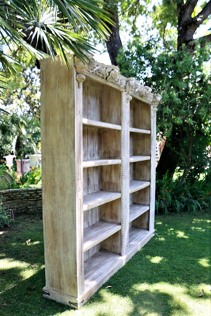 Grande libreria doppia in legno di teak decapato panna con fregio nella parte superiore e dieci ripiani