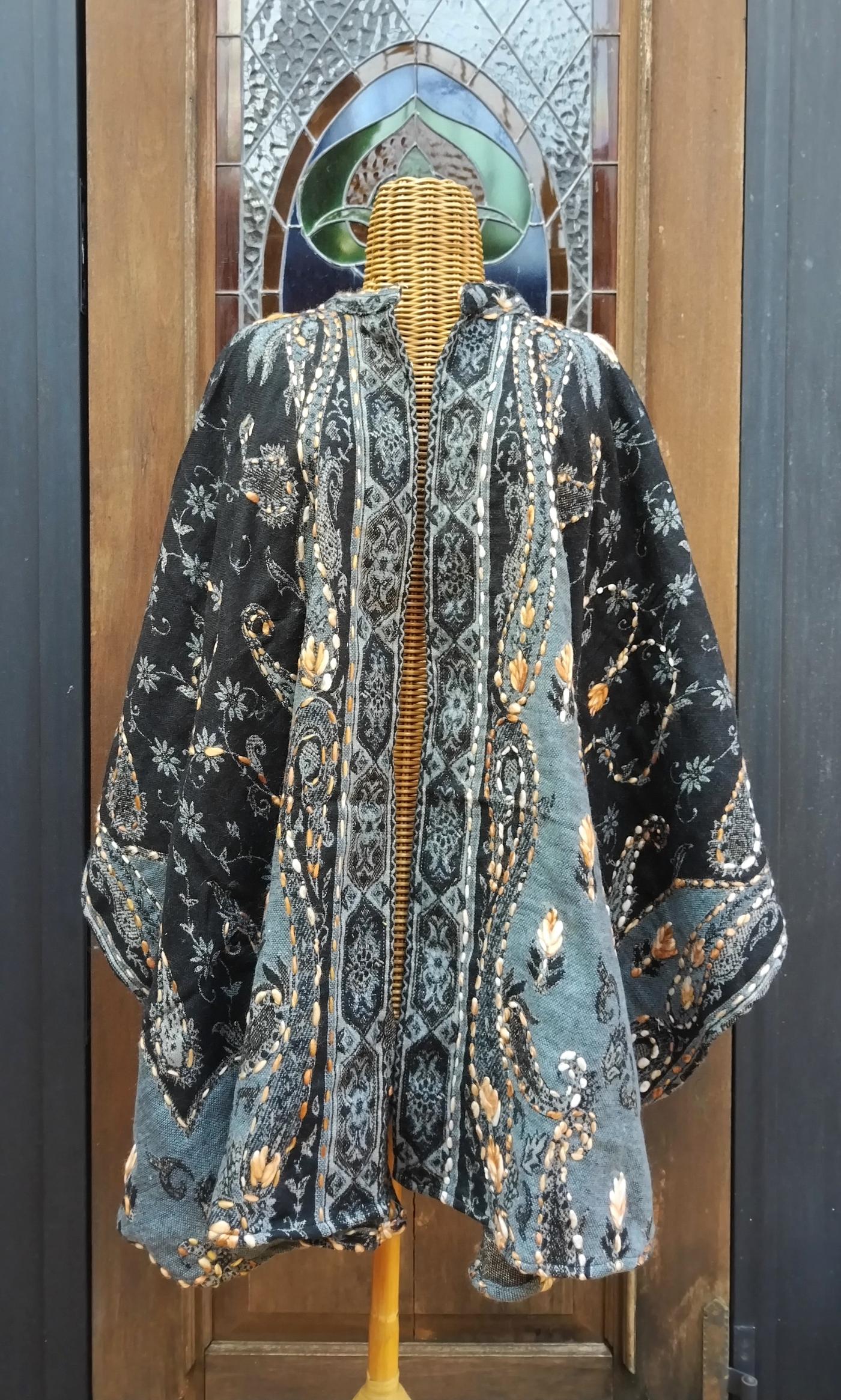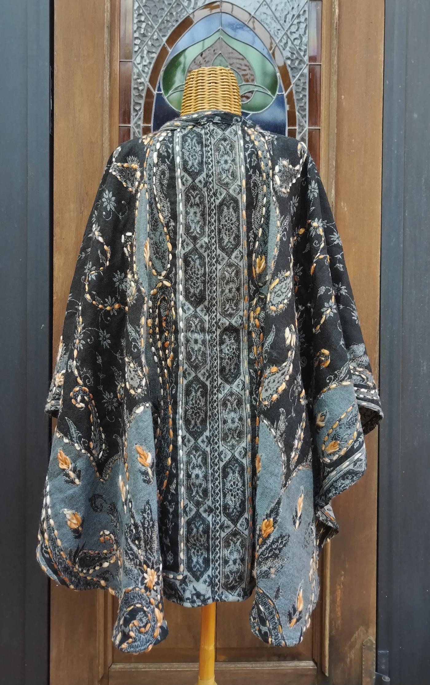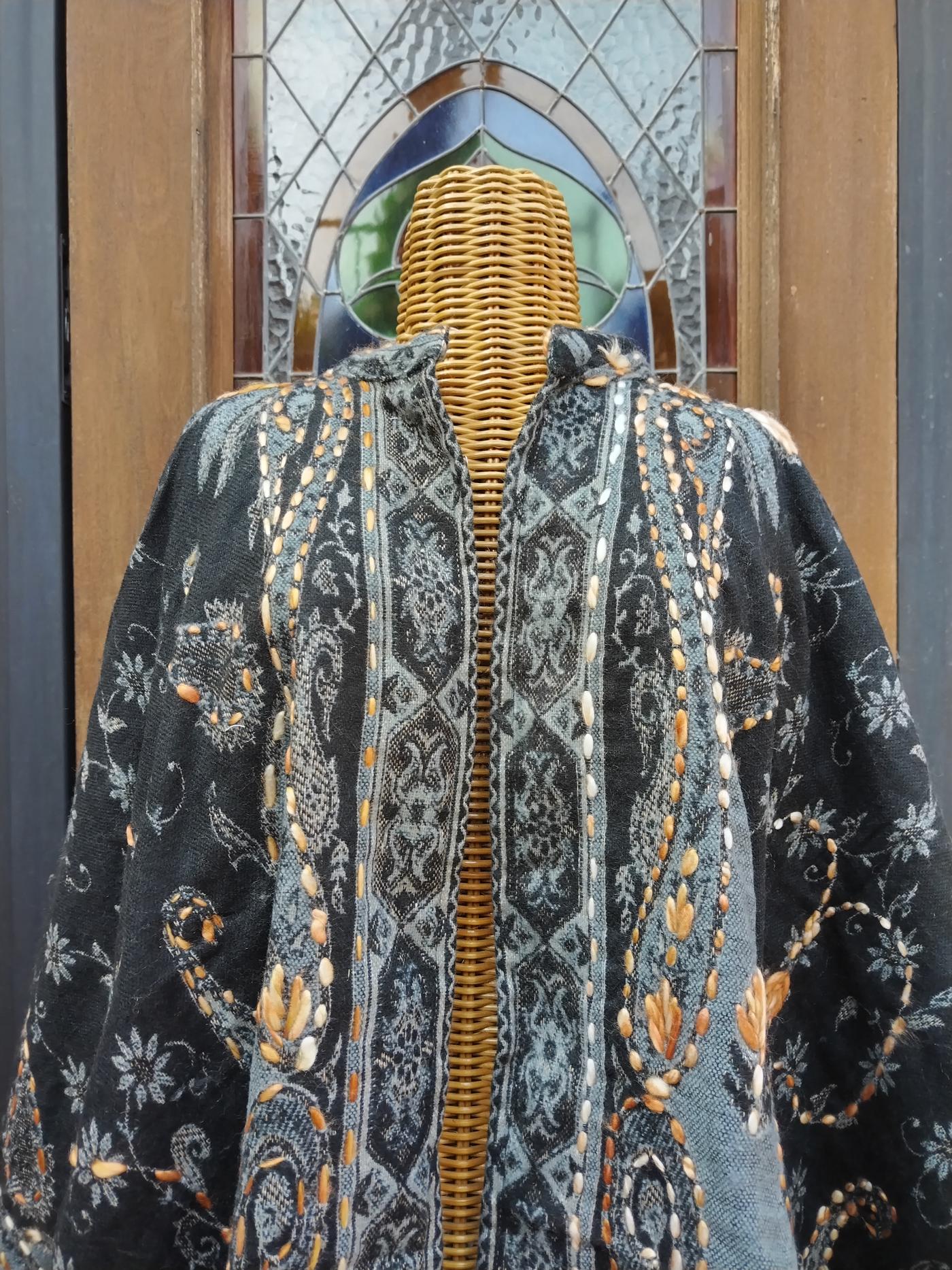 La bellezza di questa mantella è proprio nel ricco decoro del tessuto e nel suo taglio svasato, che la rende comoda e perfetta per qualsiasi tipo di fisico.