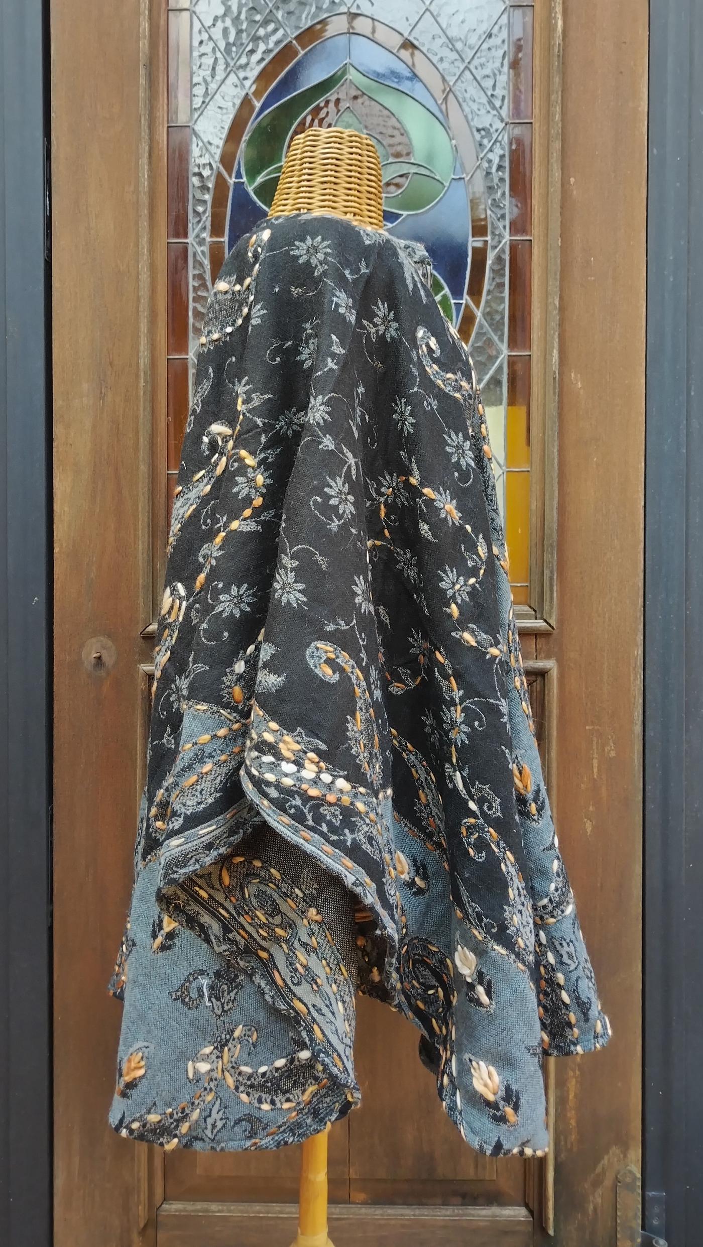 La mantella Alisha è stata realizzata in India in morbida e calda lana con fili di cachemire sui toni del nero e del grigio, con ricami a rilievo color panna che esaltano il disegno cachemire dell’abito.