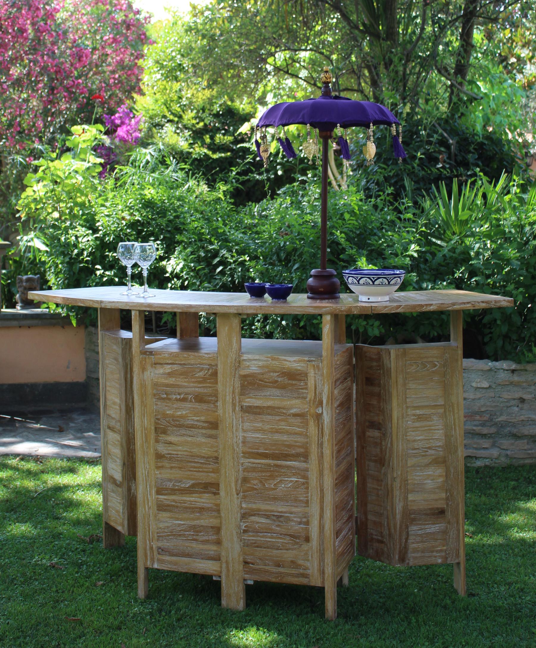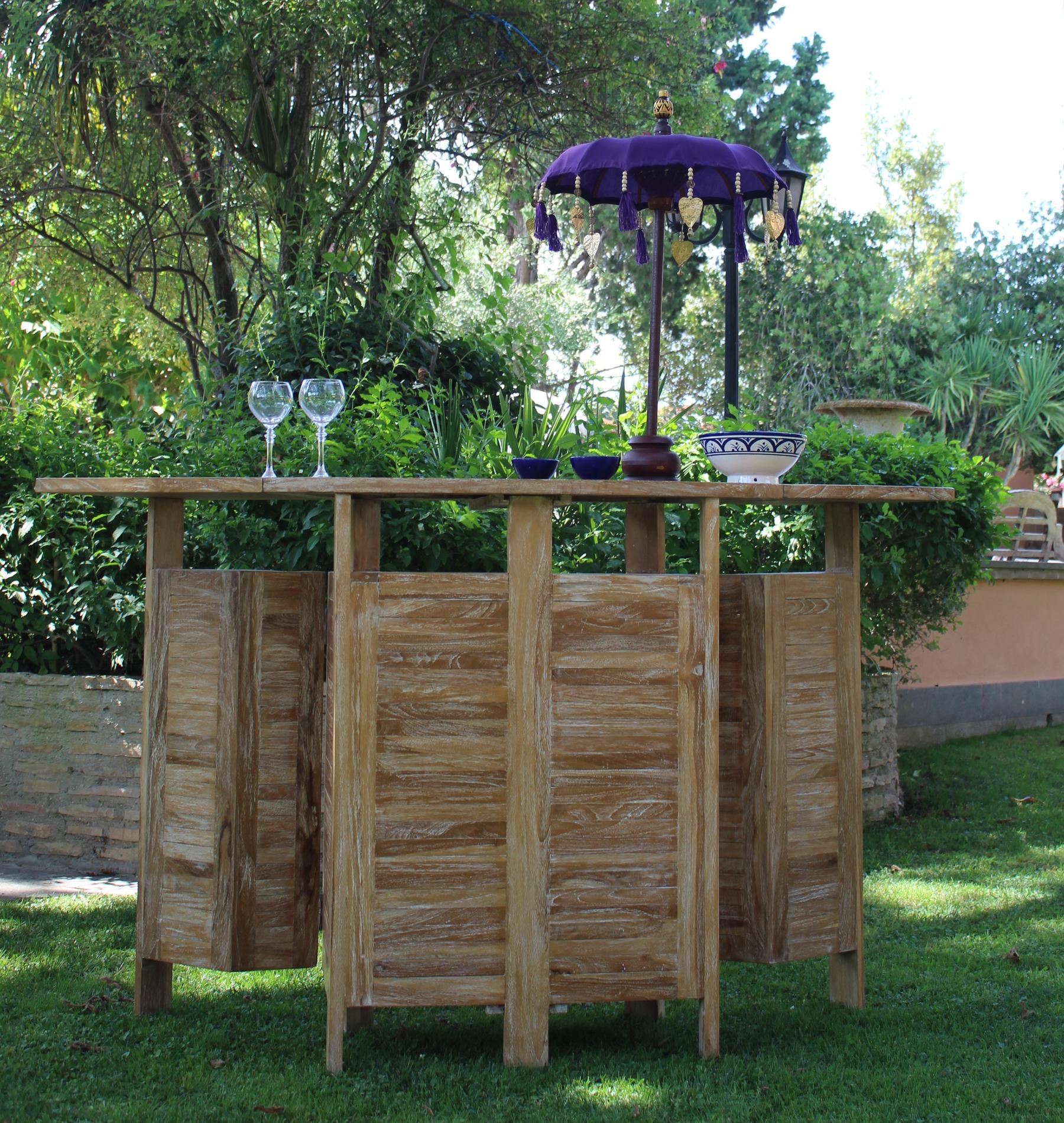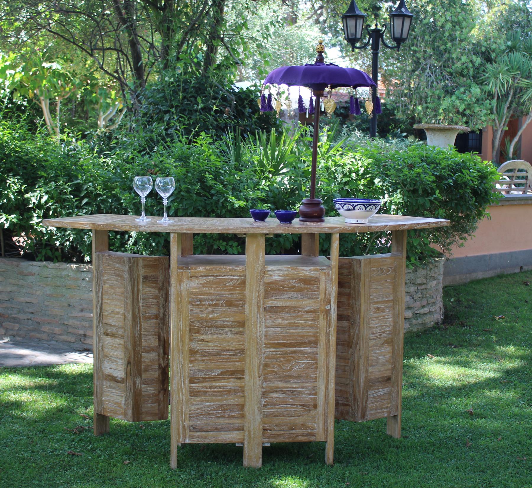 Il mobile bar Garden di forma semi circolare in legno di teak leggermente lavato bianco, ha una struttura lineare a doghe.