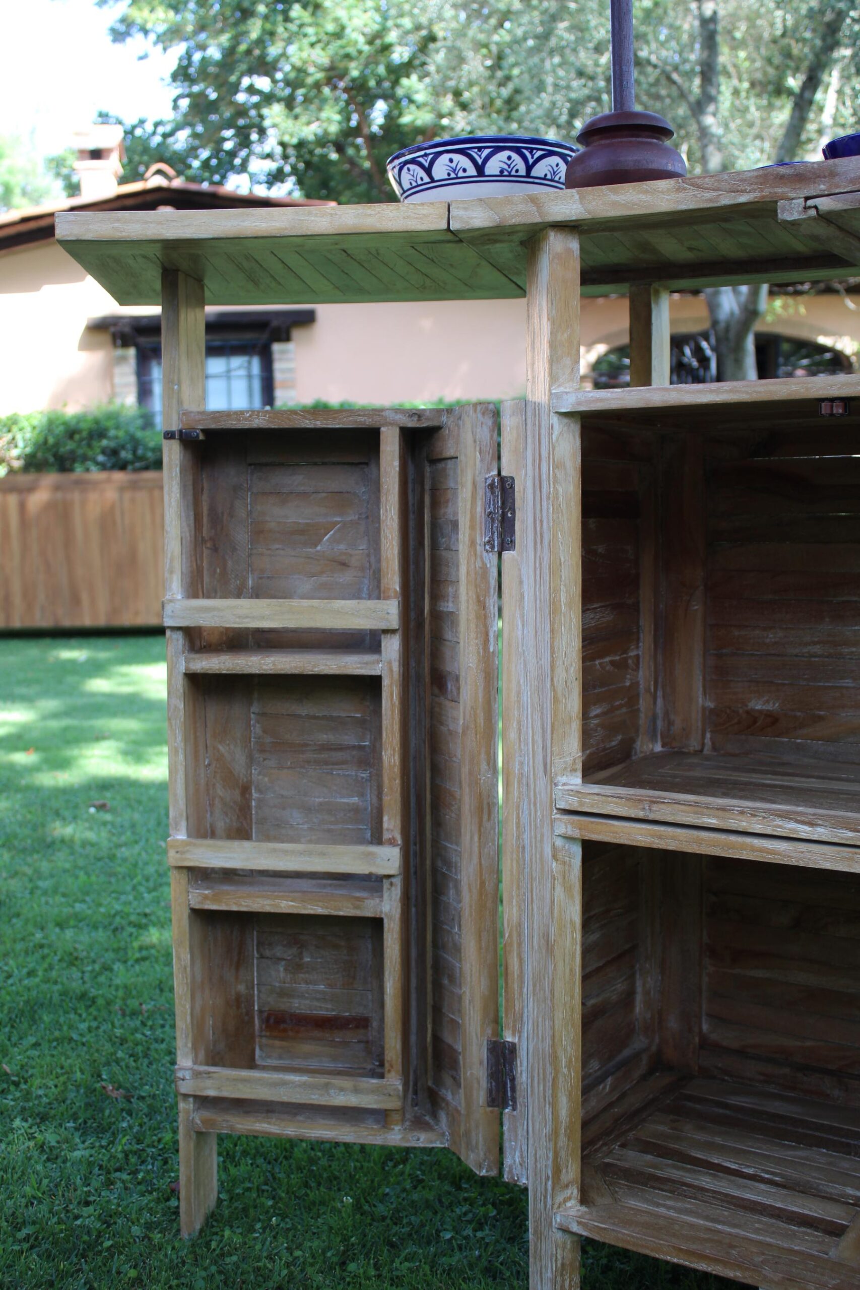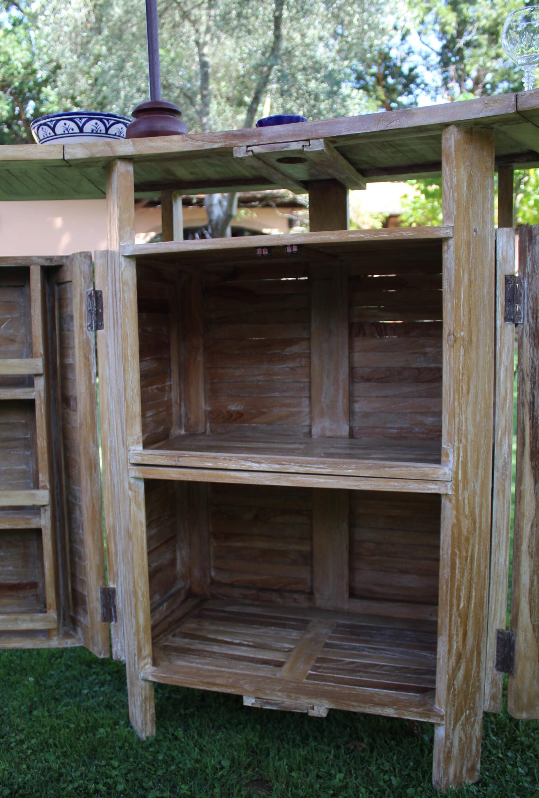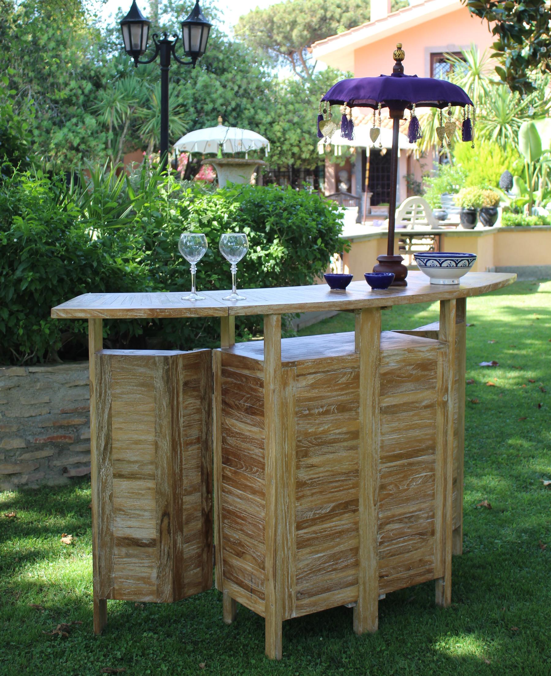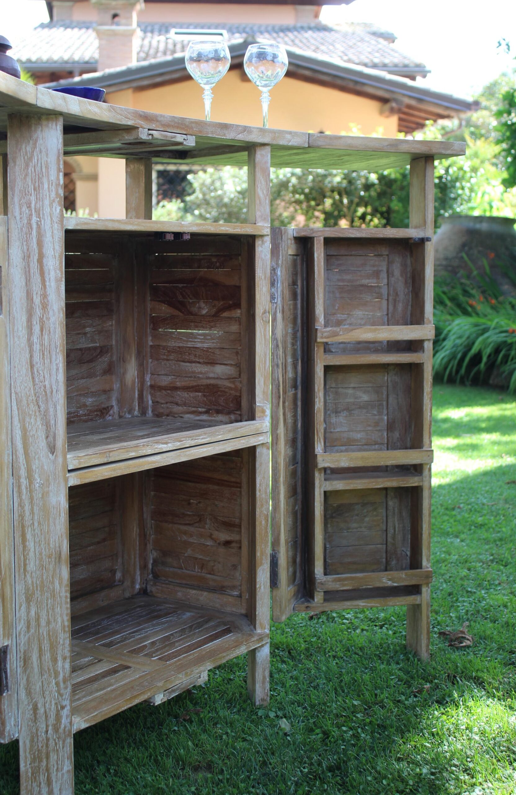 Il mobile bar Garden di forma semi circolare in legno di teak leggermente lavato bianco, ha una struttura lineare a doghe.