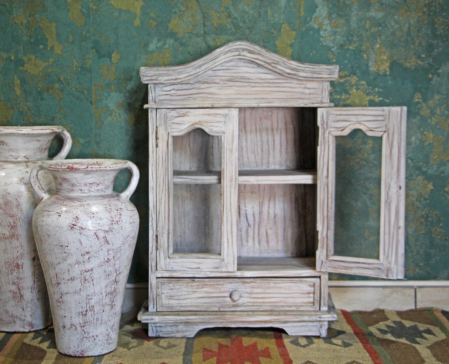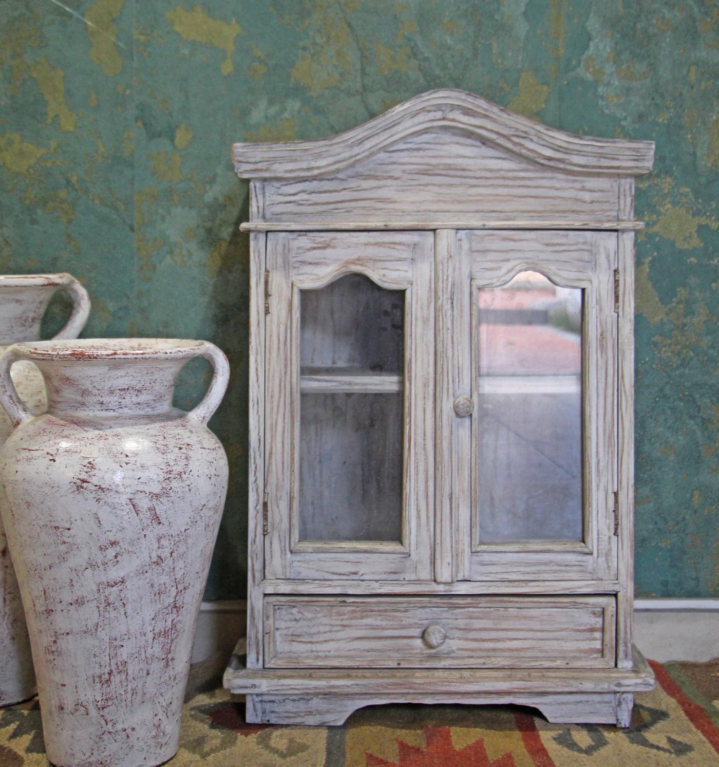 Mobiletto indonesiano in legno decapato bianco, con due ante a vetri e un cassetto
