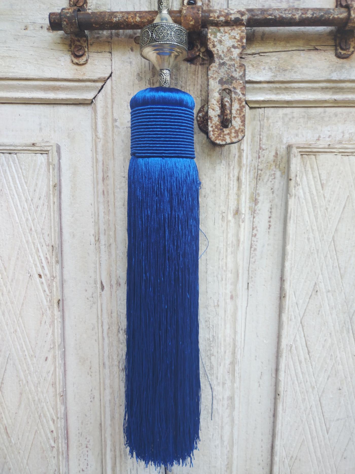 Nappa in tessuto color blu elettrico realizzata in Marocco artigianalmente con inserto in argentone decorato con motivi orientali