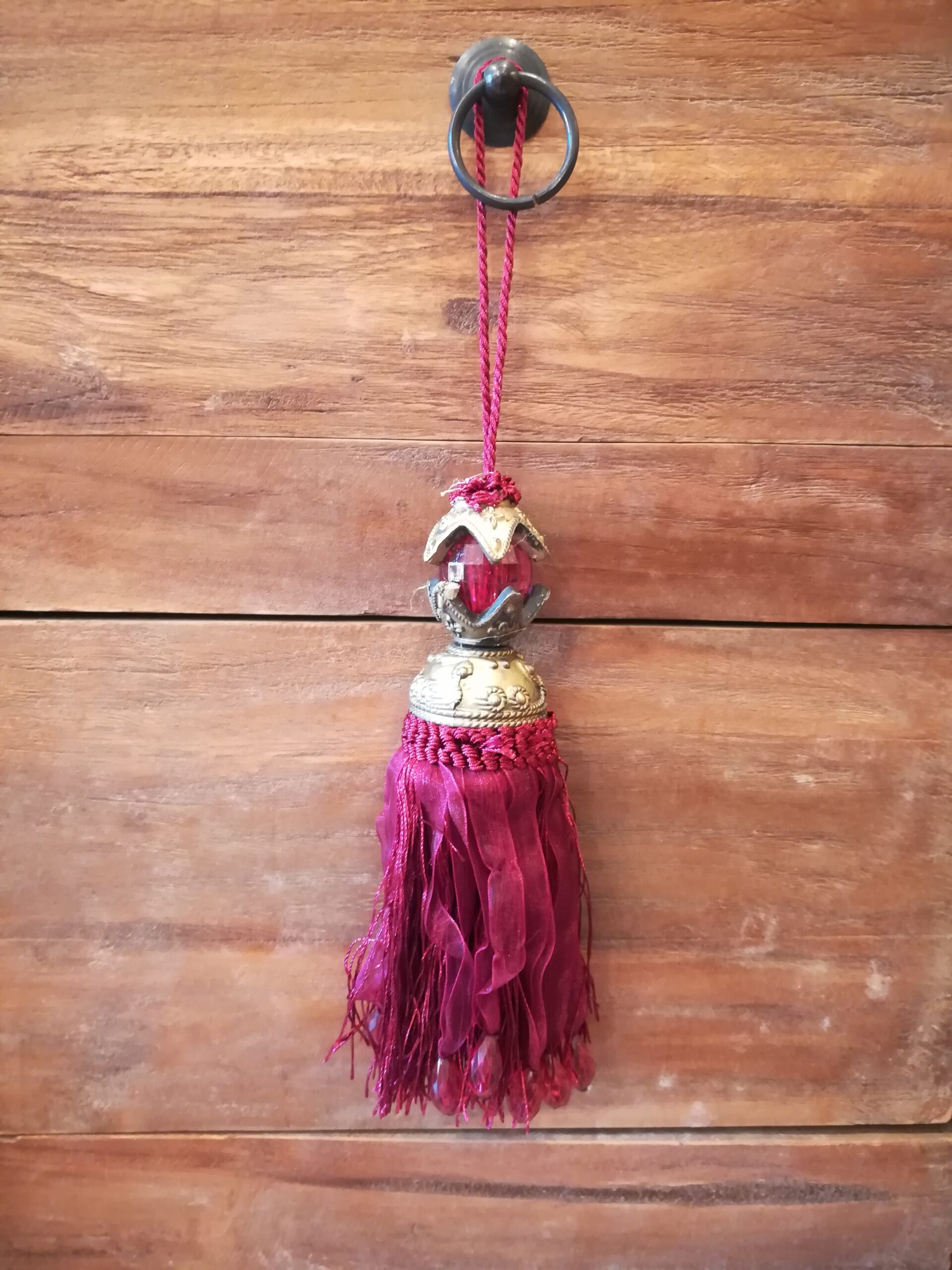 Nappe piccole decorative per le tende o per maniglie e cassetti, realizzate artigianalmente in Marocco con perline e fili di tessuto color bordeaux