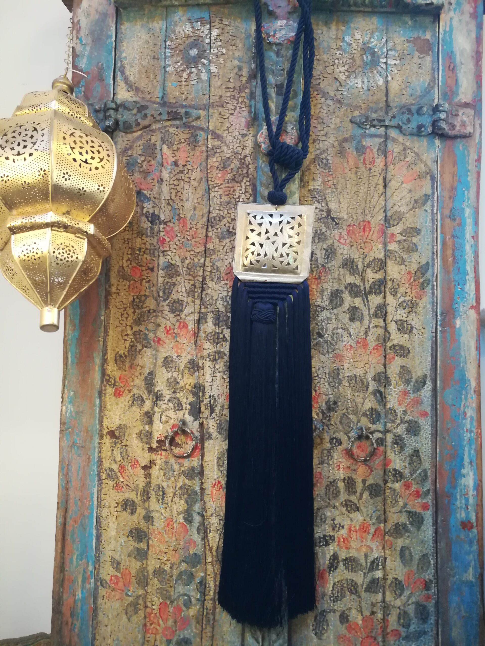 Nappa grande decorativa per le tende color blu notte realizzata artigianalmente in Marocco con placca quadrata centrale decorata in argentone con motivi orientali