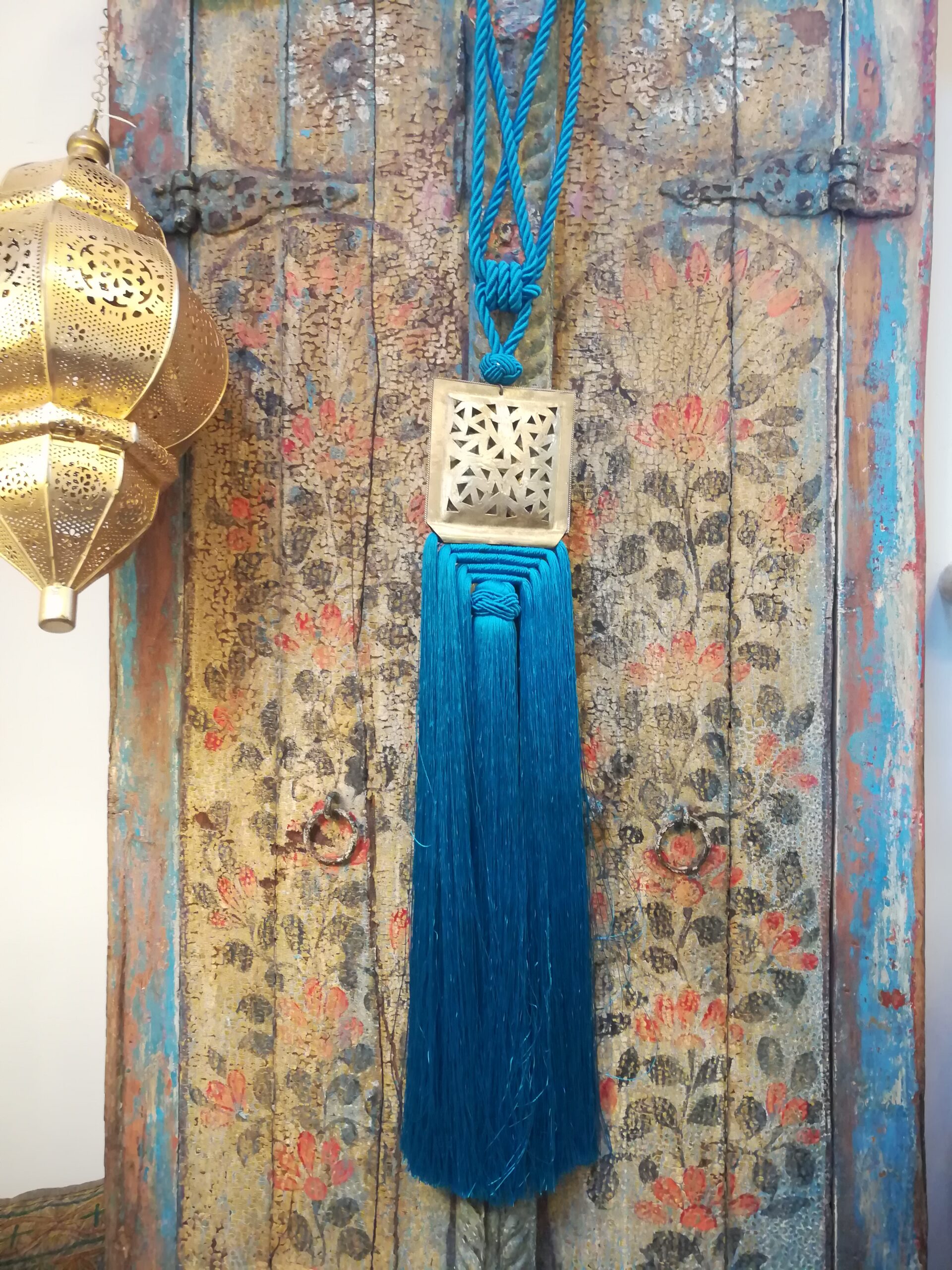 Nappa grande decorativa per le tende color turchese realizzata artigianalmente in Marocco con placca quadrata centrale decorata in argentone con motivi orientali