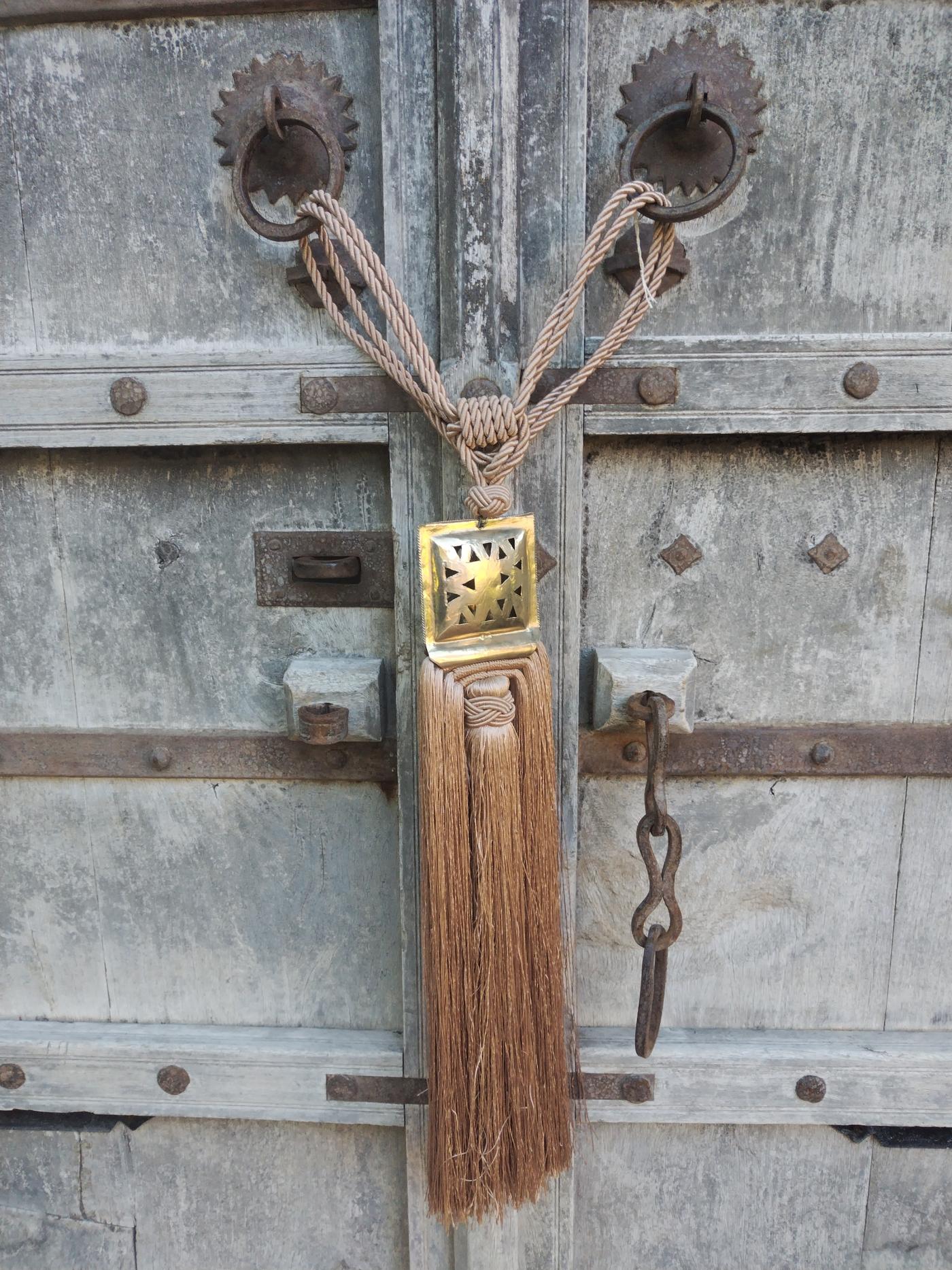 Nappa piccola decorativa per le tende color beige realizzata artigianalmente in Marocco con placca quadrata centrale decorata in argentone dorato con motivi geometrici