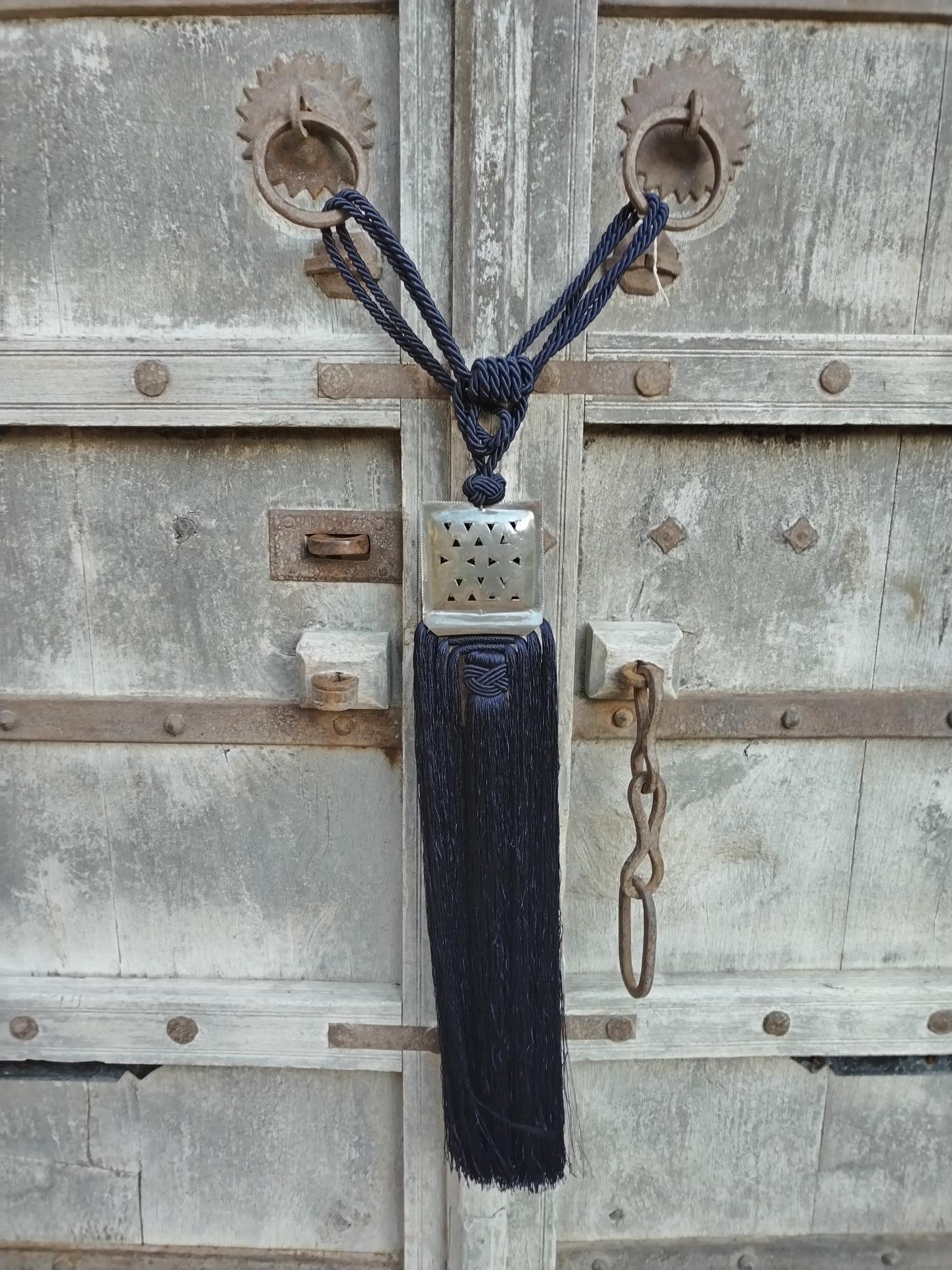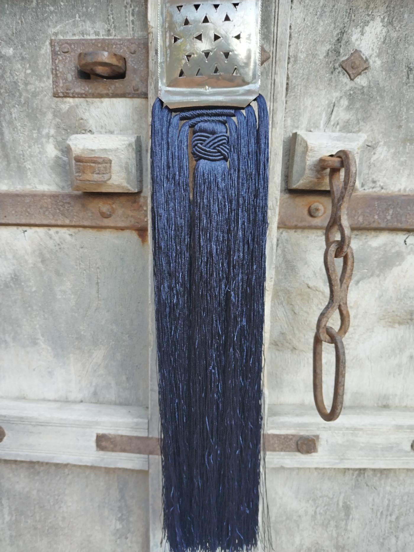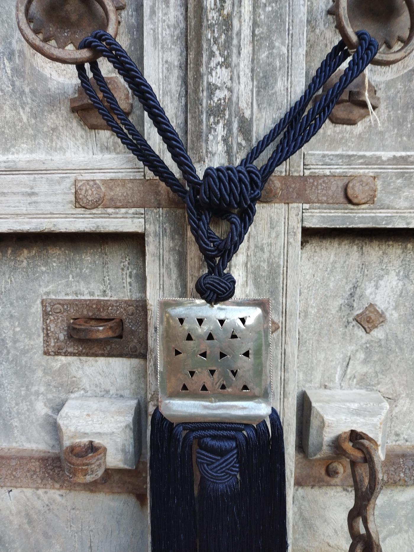 Nappa piccola decorativa per le tende color blu scuro realizzata artigianalmente in Marocco con placca quadrata centrale decorata in argentone con motivi geometrici