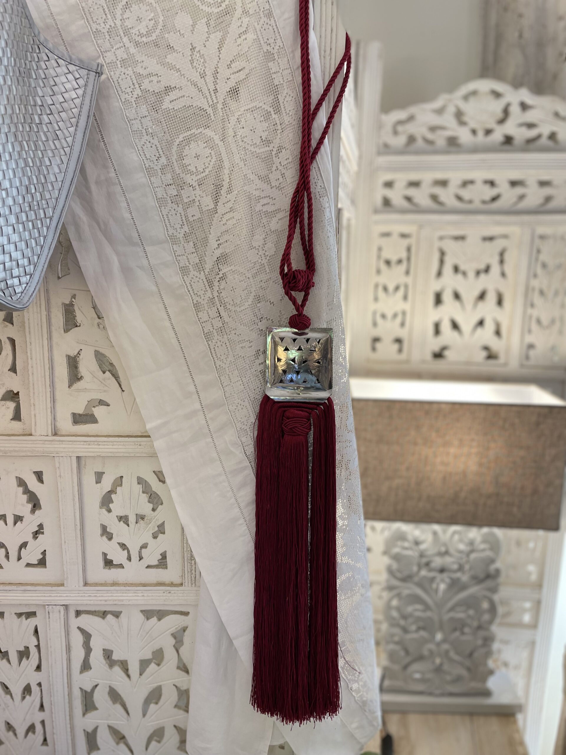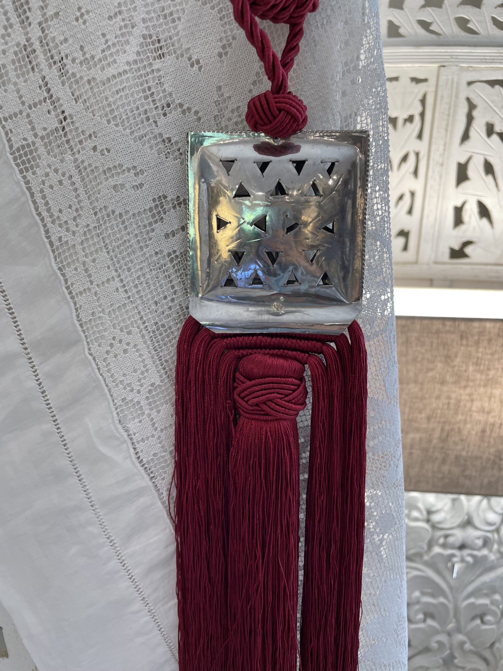 Nappa piccola decorativa per le tende color rosso scuro realizzata artigianalmente in Marocco con placca quadrata centrale decorata in argentone con motivi geometrici
