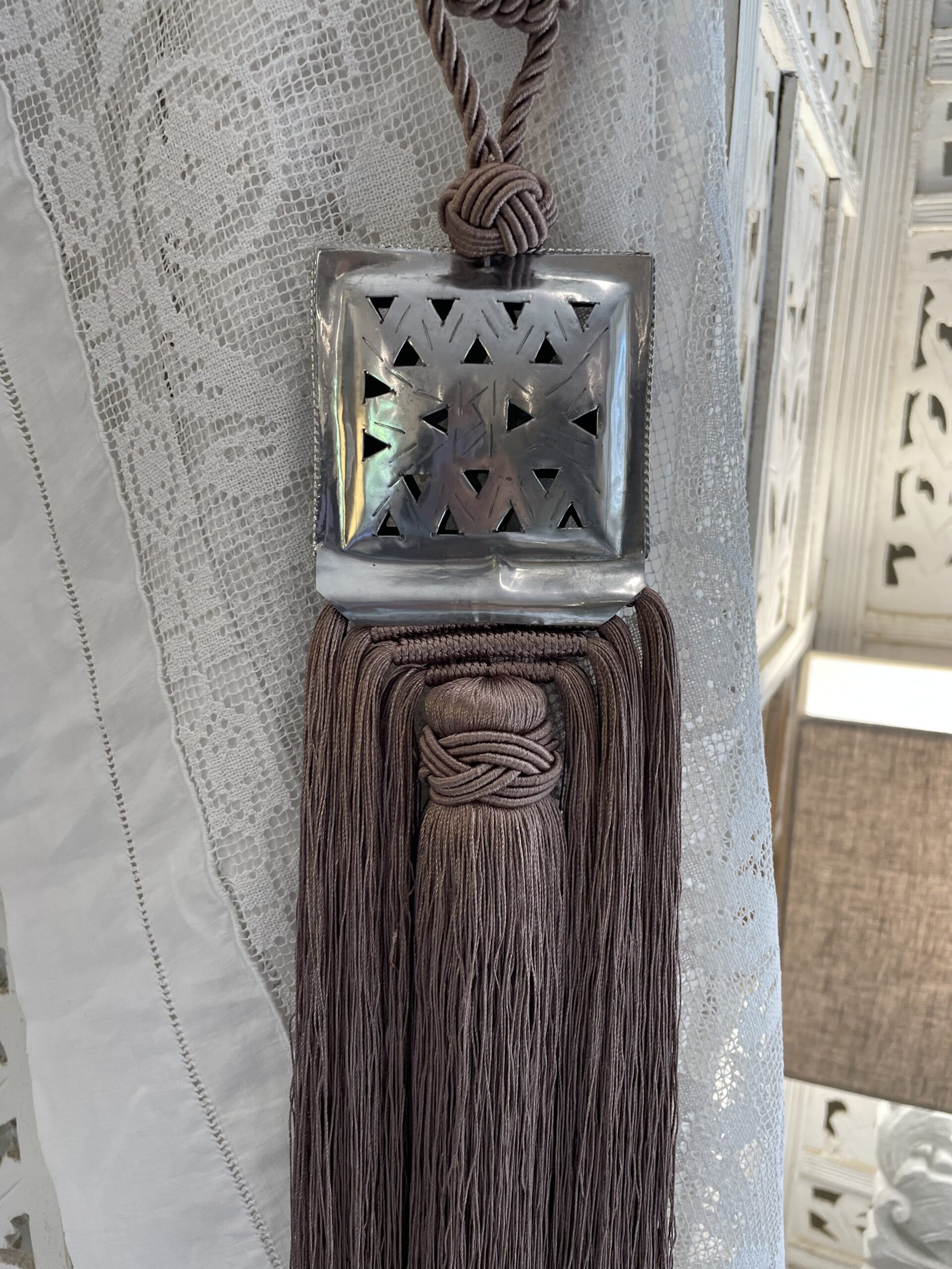 Nappa piccola decorativa per le tende color marrone chiaro realizzata artigianalmente in Marocco con placca quadrata centrale decorata in argentone con motivi geometrici