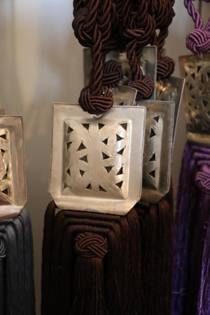 I motivi geometrici incisi sulla superficie dell’argento aggiungono un elemento di design tradizionale e raffinato, tipico dell’artigianato marocchino, creando un bellissimo contrasto con la morbidezza e la leggerezza della nappa stessa.