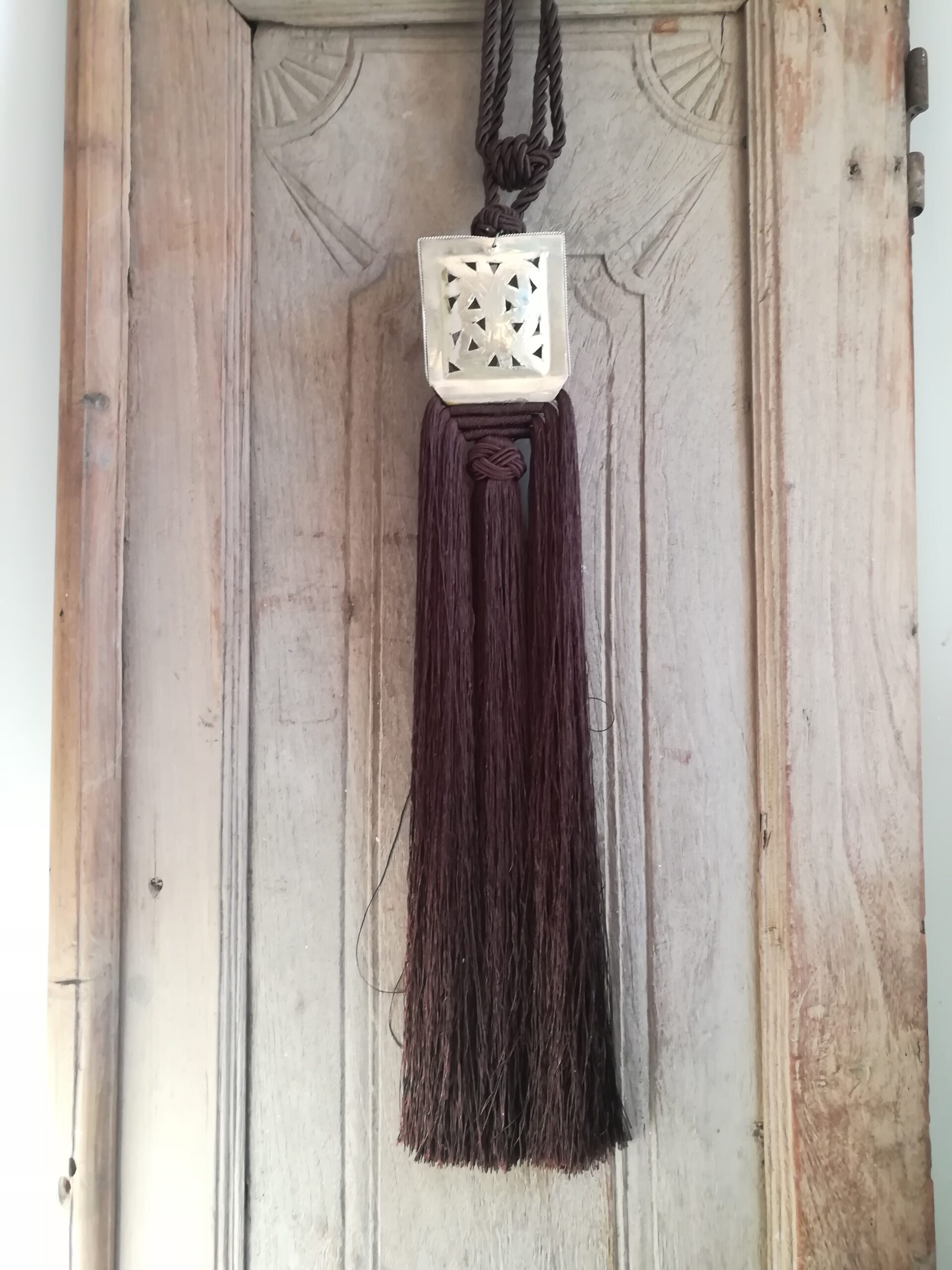 Nappa grande decorativa per le tende color marrone realizzata artigianalmente in Marocco con placca quadrata centrale decorata in argentone con motivi geometrici
