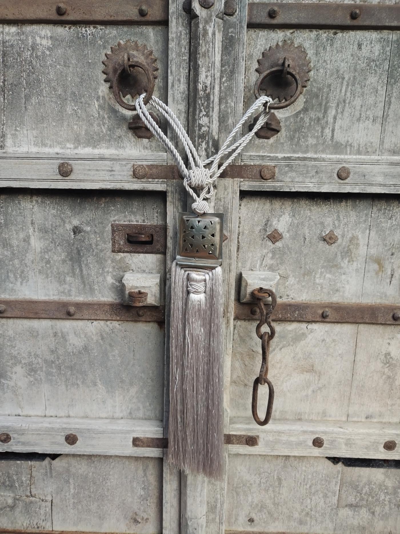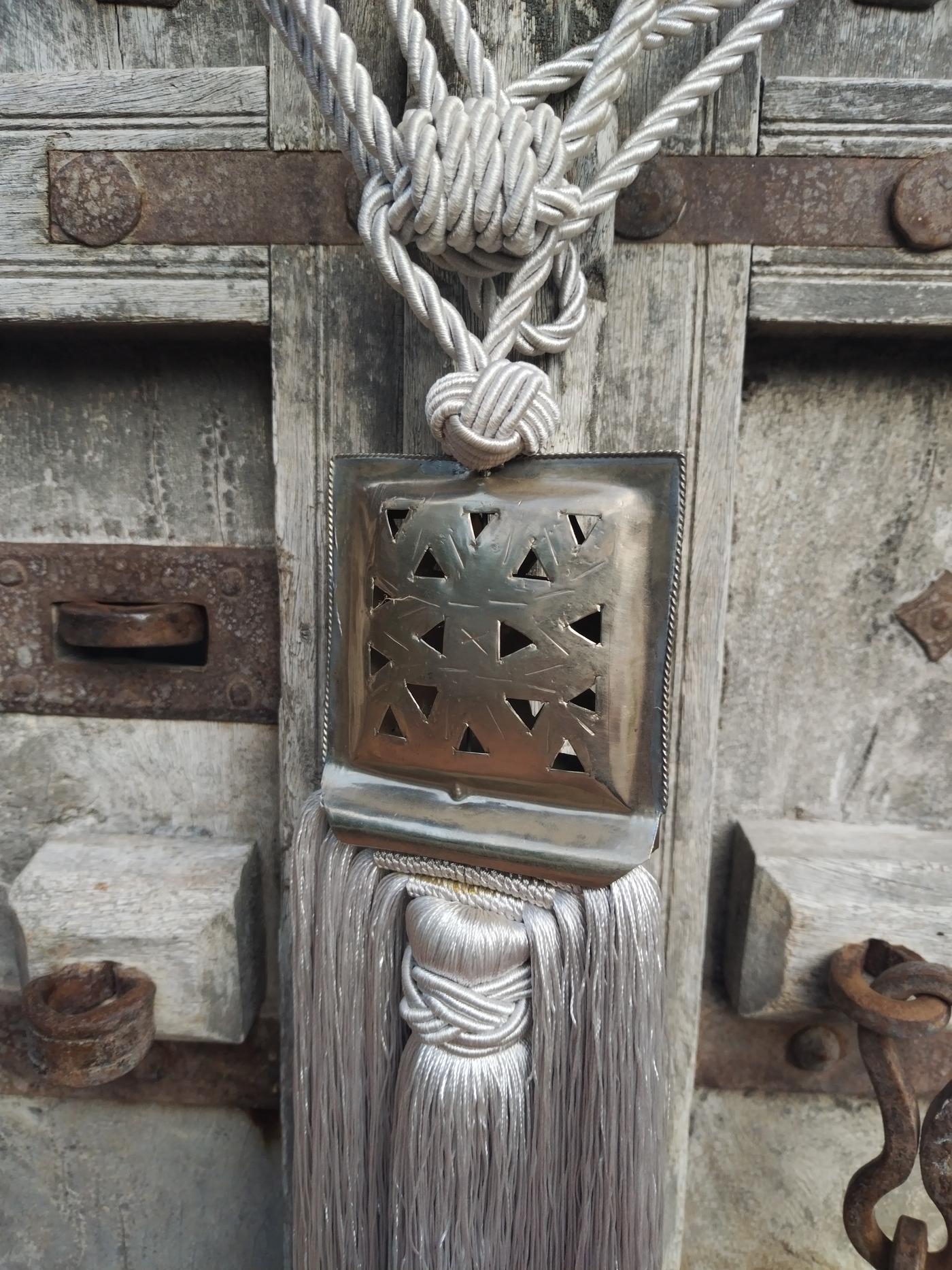 Nappa piccola decorativa per le tende color ghiaccio realizzata artigianalmente in Marocco con placca quadrata centrale decorata in argentone dorato con motivi geometrici