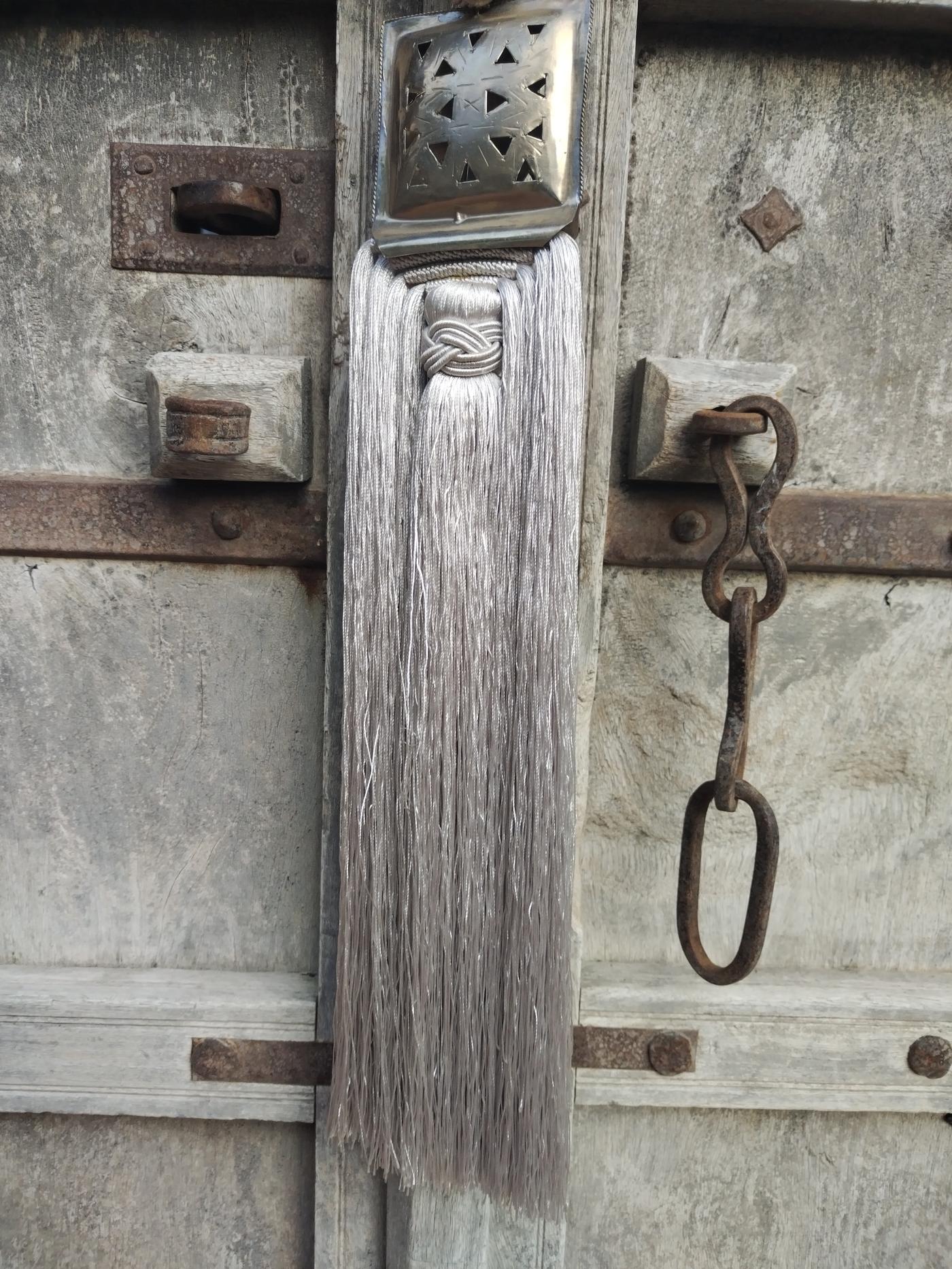 I motivi geometrici incisi sulla superficie dell’argento aggiungono un elemento di design tradizionale e raffinato, tipico dell’artigianato marocchino, creando un bellissimo contrasto con la morbidezza e la leggerezza della nappa stessa.
