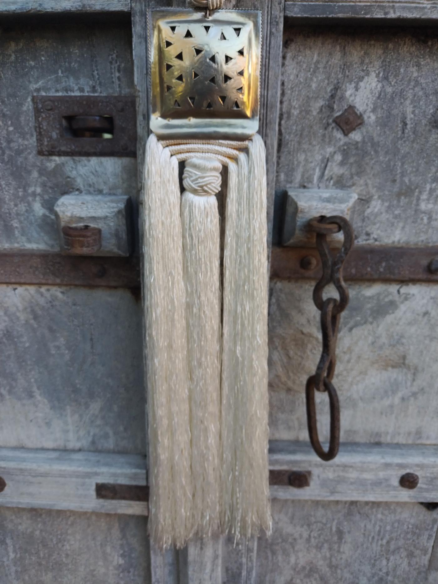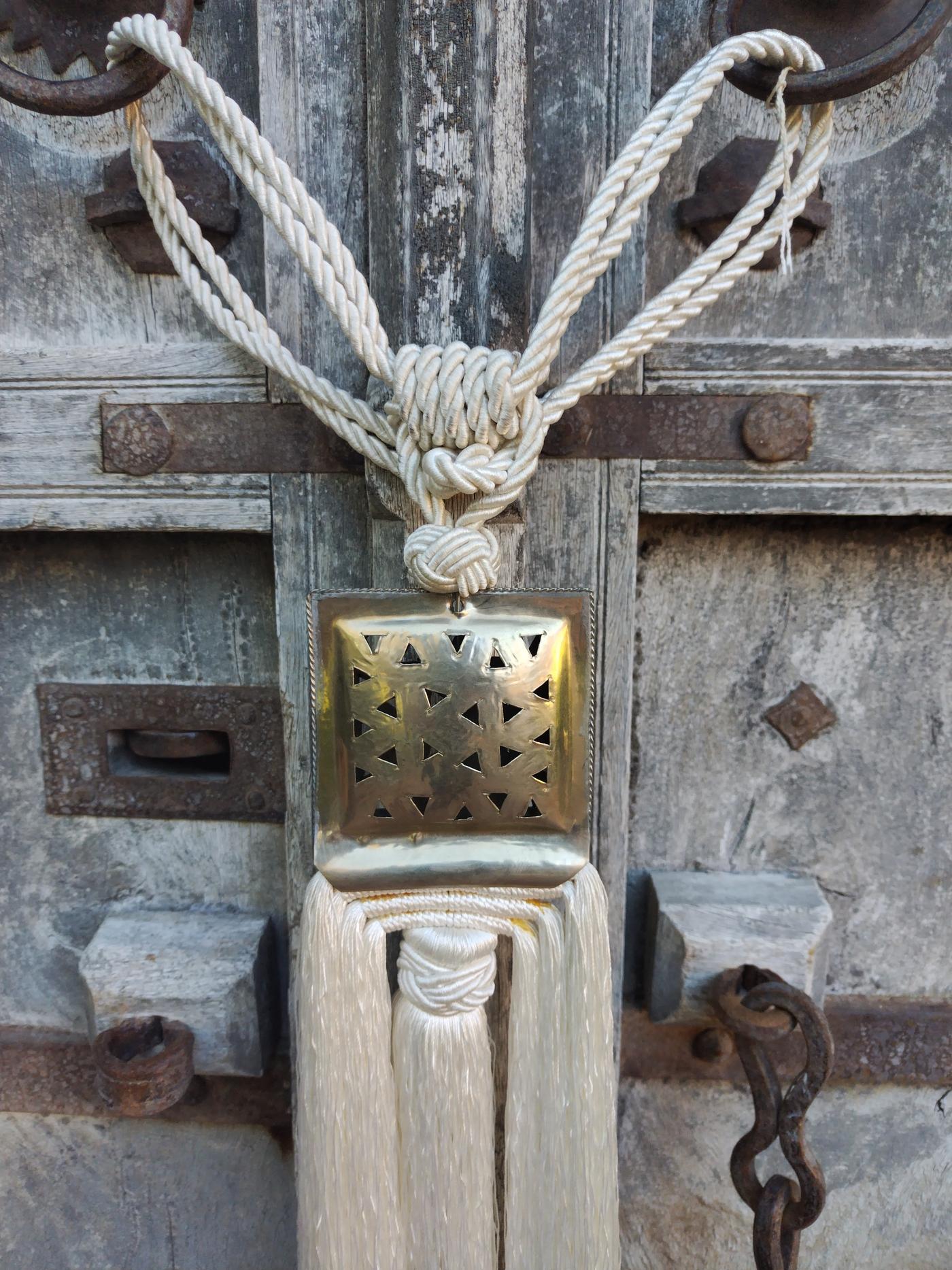 Nappa piccola decorativa per le tende color panna realizzata artigianalmente in Marocco con placca quadrata centrale decorata in argentone con motivi geometrici