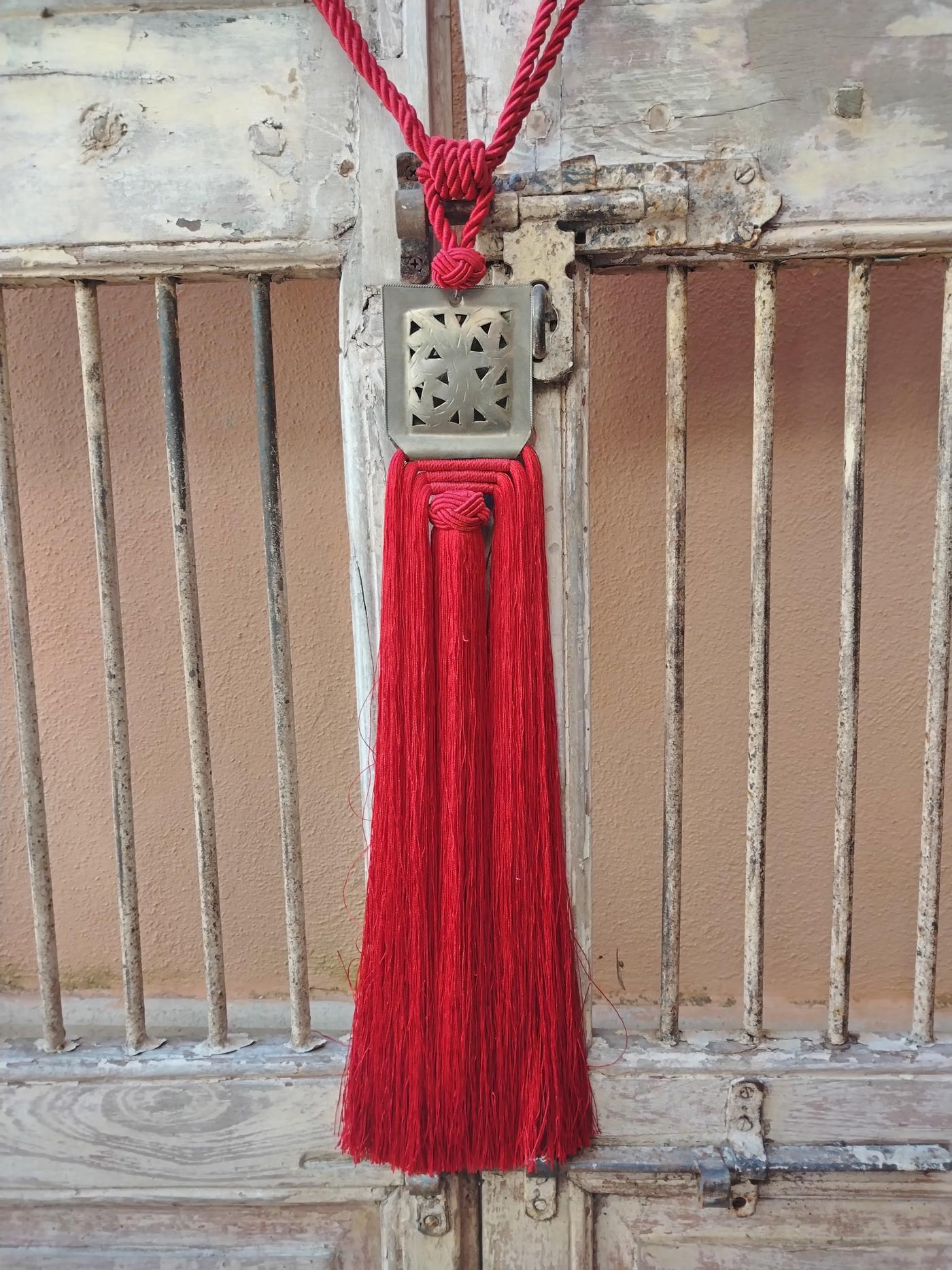 Nappa piccola decorativa per le tende color rosso realizzata artigianalmente in Marocco con placca quadrata centrale decorata in argentone con motivi geometrici